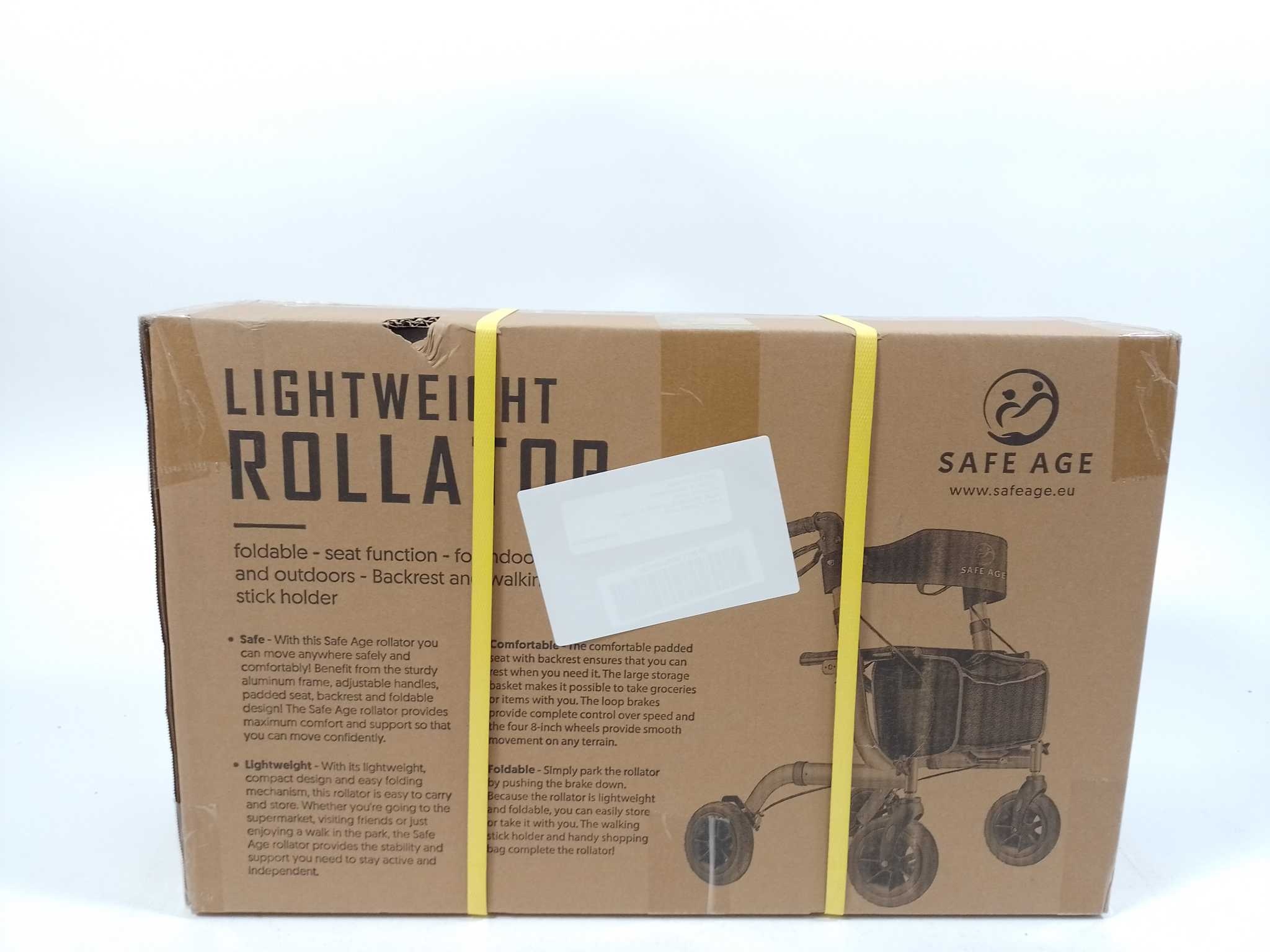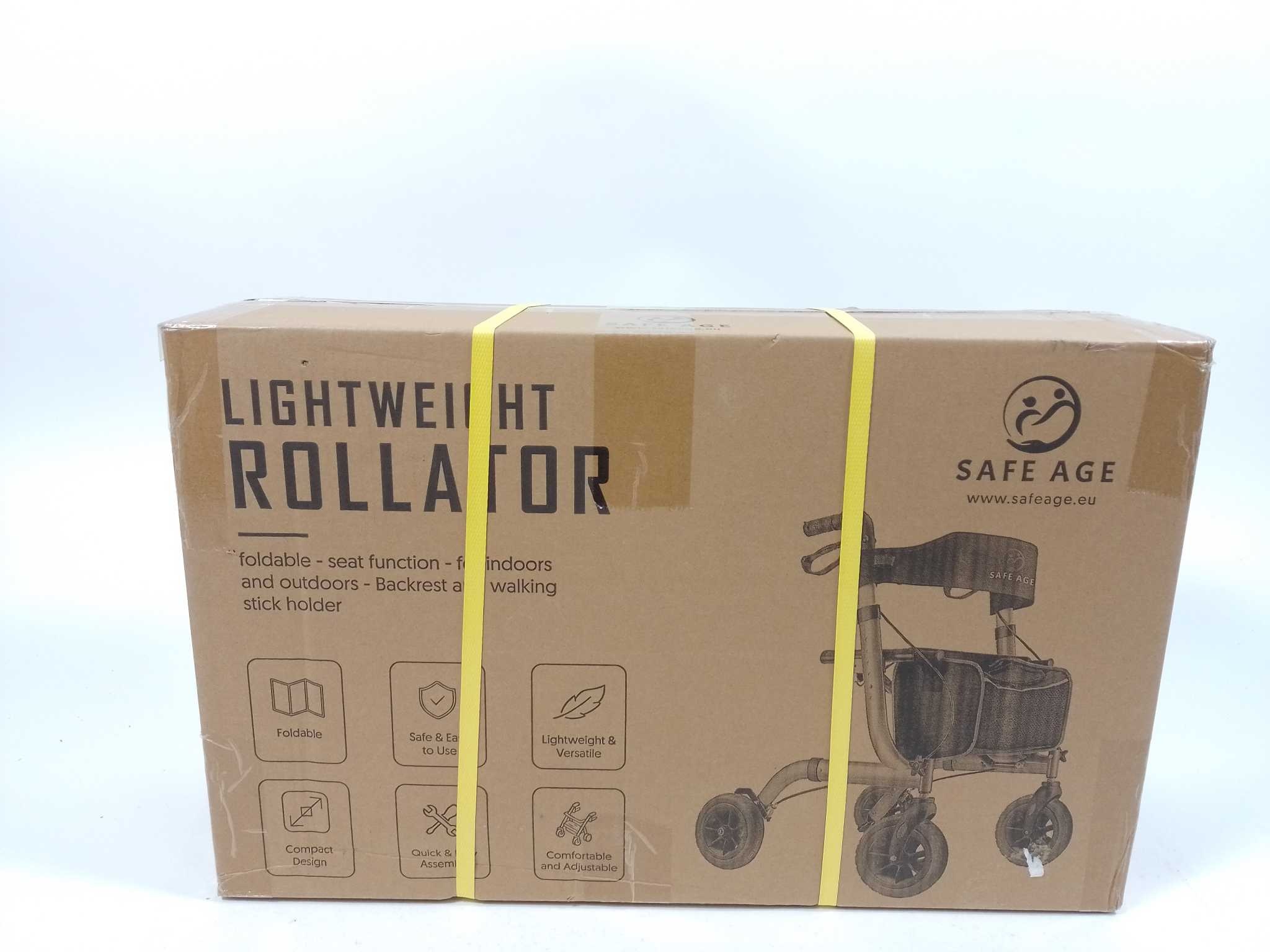 Safe Age Rollator - Goud. De Safe Age rollator in goud combineert stijl met zekerheid voor binnen en buiten. Het naadloze aluminium frame weegt slechts 7 kg en draagt tot 137 kg. Verstel de handgrepen in 6 hoogtes (85–99 cm) voor een ergonomische houding. Vier 8-inch 360° rubberen anti-slip wielen rollen soepel over stoep en klinkers. Met dubbel remsysteem en parkeerstand sta je stabiel stil overal. Rust comfortabel op de extra brede, gevoerde zitting met rugleuning. Inclusief afneembare nylon boodschappentas (19 L), wandelstok/parapluhouder en handleiding.