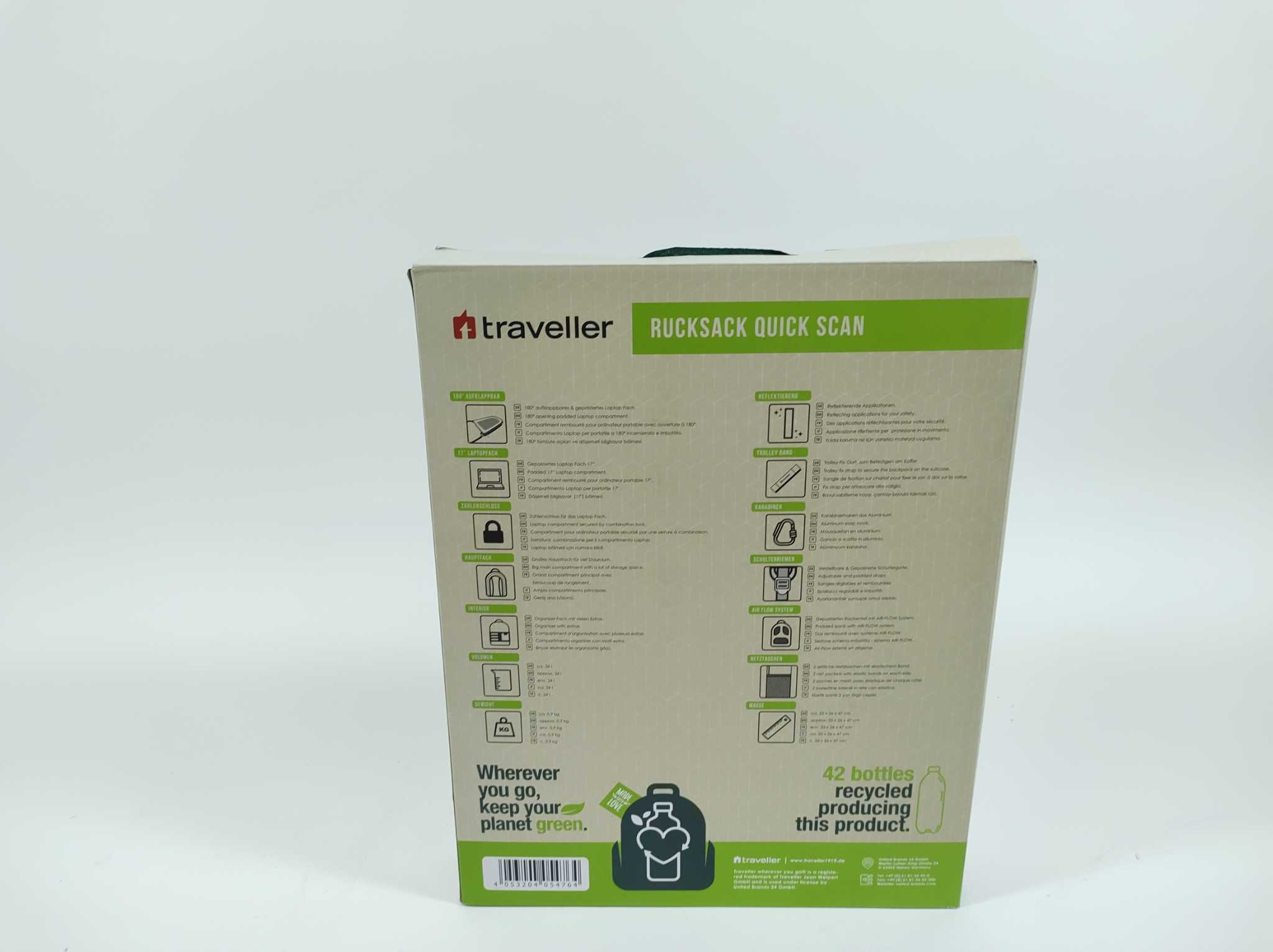 Traveller Rugzak PROnature - 48cm - Zwart. De Traveller PROnature Quick Scan rugzak is een functionele zwarte reisrugzak voor werk, school en onderweg. Het hoofdvak bevat een laptopvak tot 17 inch dat 180 graden opent, ideaal voor snelle controles op reis. Daarnaast biedt de tas een organizer vak, zijvakken van mesh en een handige trolleyband voor bevestiging aan je koffer. De verstelbare gewatteerde schouderbanden en het gevoerde rugpand zorgen voor extra draagcomfort. Gemaakt van duurzaam RPET voor praktisch en modern dagelijks gebruik bij elke trip of werkdag.