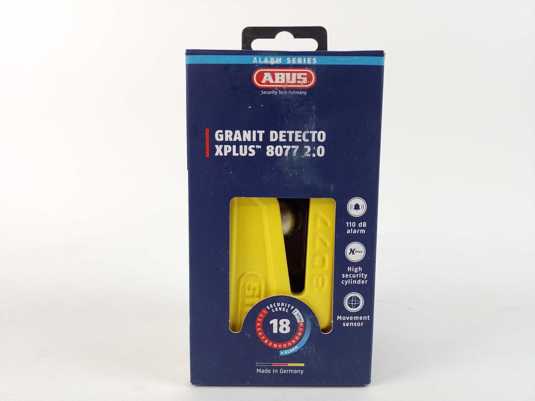 ABUS Schijfremslot Granit Detecto XPlus - 8077 2.0 - Geel. Bescherm je motor met de ABUS Granit Detecto XPlus 8077 2.0, een ART-4 schijfremslot met 100 dB alarm en slimme 3D-positiedetectie. De 13,5 mm geharde pen en XPlus-cilinder bieden maximale weerstand tegen picking en brute kracht. Automatische remschijfdetectie en LED-status zorgen voor zorgeloze bediening. Compact en 940 g, ideaal voor onderweg. Inclusief twee sleutels en AAA-batterijen. Perfect voor hoogwaardige motorfietsen bij hoog diefstalrisico: sterk, gebruiksvriendelijk en zichtbaar afschrikkend. Combineer desgewenst met ketting voor extra zekerheid tijdens langere parkeerperiodes en overnachtingen.