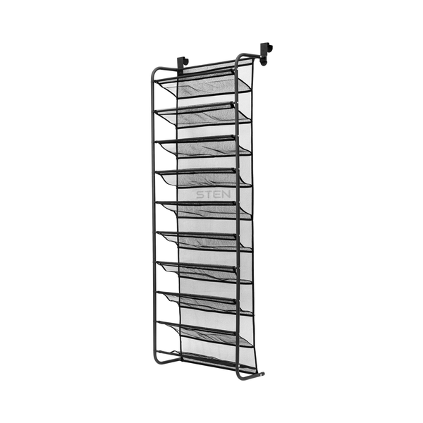 STEN Schoenenrek voor Deur. Het STEN schoenenrek voor de deur organiseert tot 30 paar schoenen in 10 niveaus, zonder boren. De stevige metalen constructie bespaart ruimte en past op stompe én opdekdeuren. Vier meegeleverde haken bieden 4 hangmethodes voor
