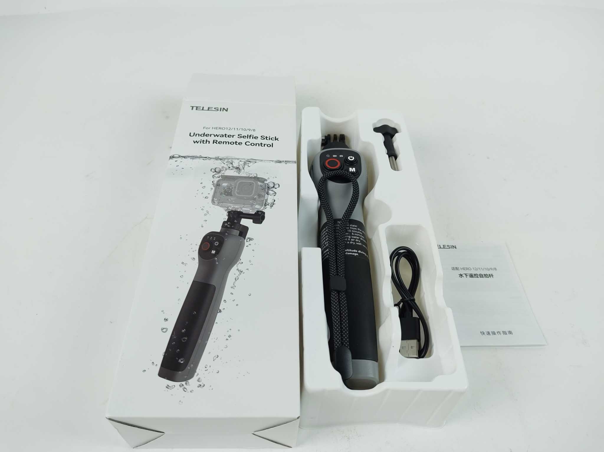 Telesin Selfie Stick - GP-WBT-001. Telesin GP-WBT-001 onderwater selfiestick maakt filmen en fotograferen met je GoPro eenvoudiger tijdens duiken en snorkelen. Bedien je GoPro op afstand onder water: foto’s maken, modi wisselen en aan/uit zetten. De uitschuifbare grip reikt tot 85 cm en is waterdicht tot 30 meter, ideaal voor koraal en brede shots. Compatibel met GoPro HERO 8 t/m 13. Inclusief waterdichte houder, polsband, USB-laadkabel, schroef en handleiding. Licht, stevig en vast te houden, perfect voor watersportvakanties, boottochten en vlogs met vrienden of familie.