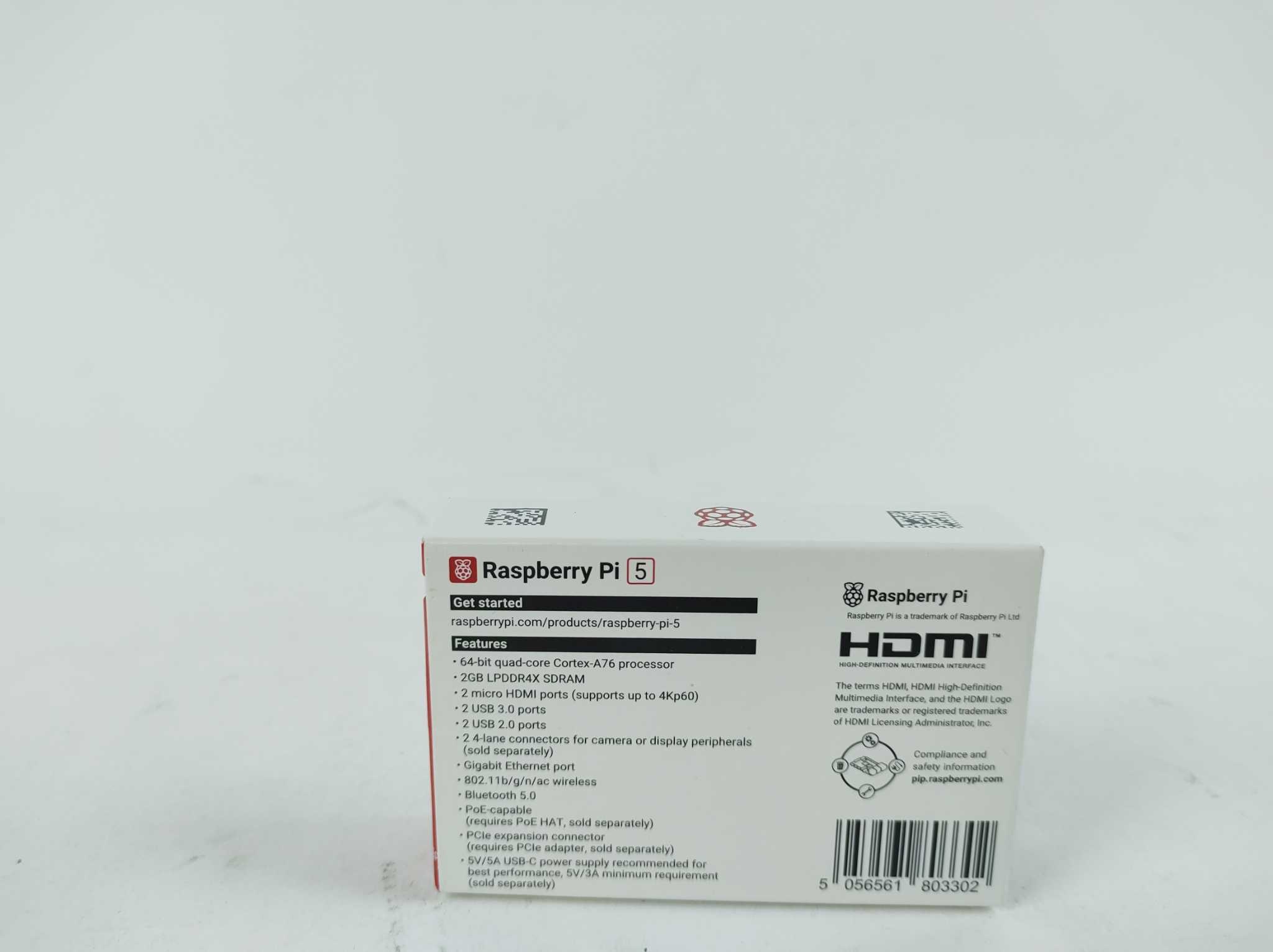 Raspberry Pi Single-Board Computer 5 - 2GB. Raspberry Pi 5 2GB is een krachtige single-board computer voor projecten, onderwijs en lichte desktoptaken. Quad-core 2,4 GHz Cortex-A76 en VideoCore VII leveren vlotte prestaties; dual 4Kp60 micro-HDMI, PCIe 2.