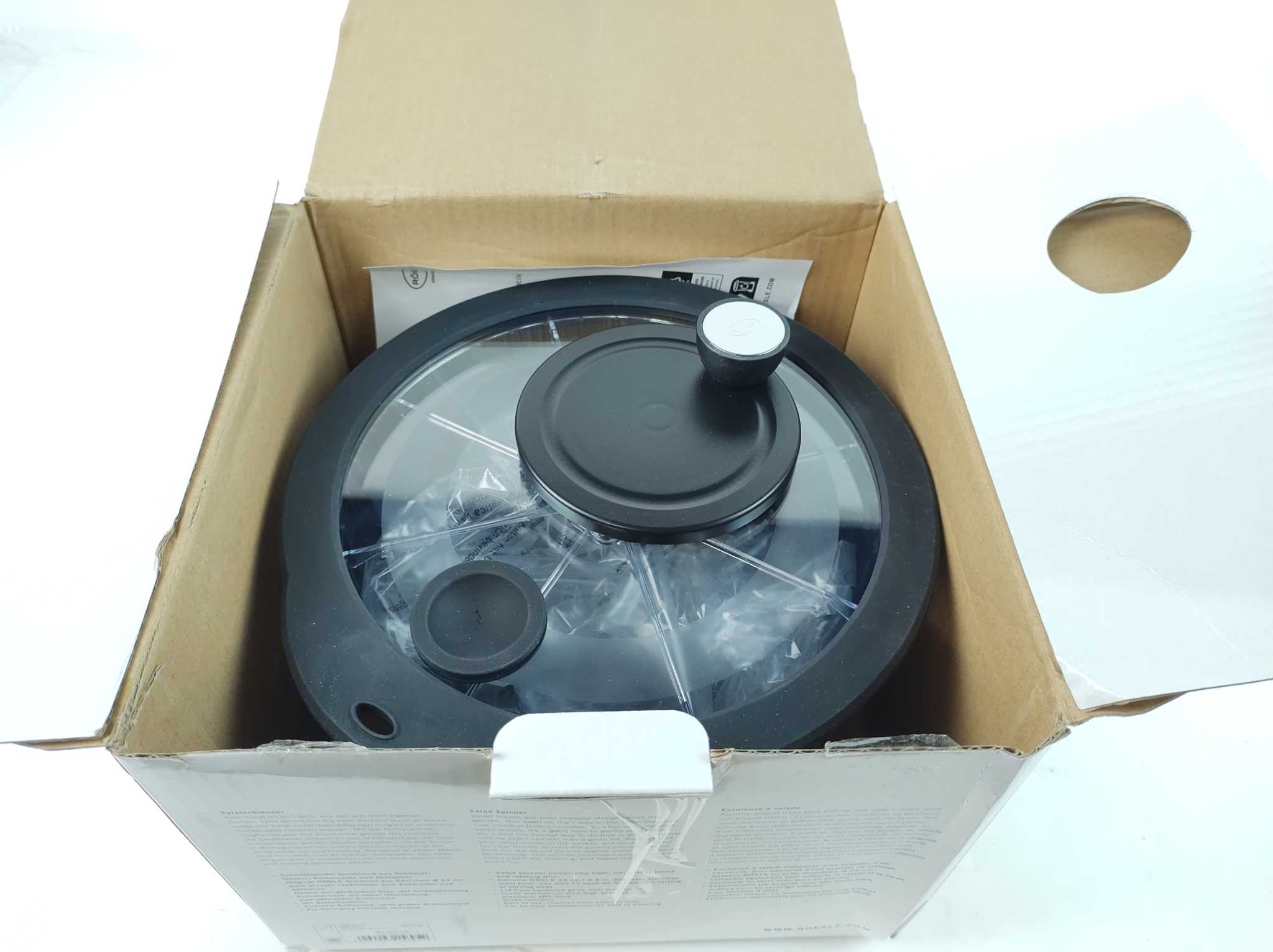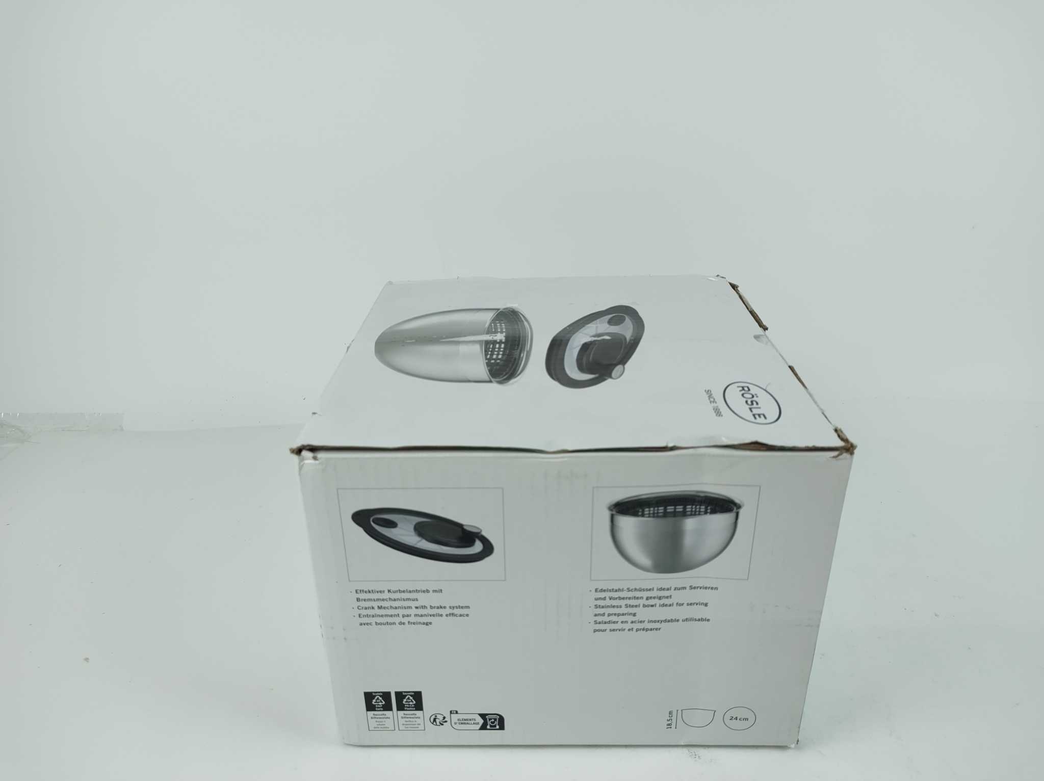 Rösle Slacentrifuge met Deksel - 5,4L. De Rösle slacentrifuge van 24 cm combineert stijl, capaciteit en gebruiksgemak in één slimme keukenhulp. Met een inhoud van 5,4 liter droog je sla, kruiden en groenten snel en efficiënt. De roestvrijstalen kom is stevig en veelzijdig, want je gebruikt hem ook als meng- of serveerschaal. Dankzij de 4:1 zwengelaandrijving centrifugeer je krachtig en comfortabel. Inclusief glazen deksel, mandinzet en draaiplateau, zodat je direct compleet aan de slag kunt in elke moderne keuken met dagelijks kookgemak.