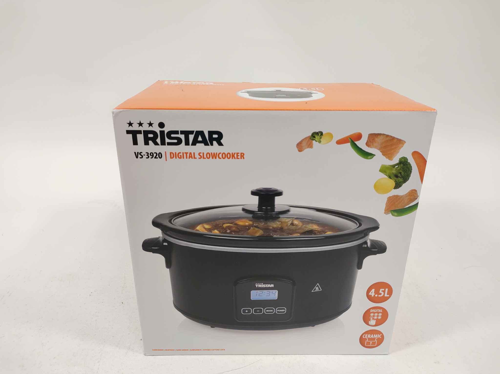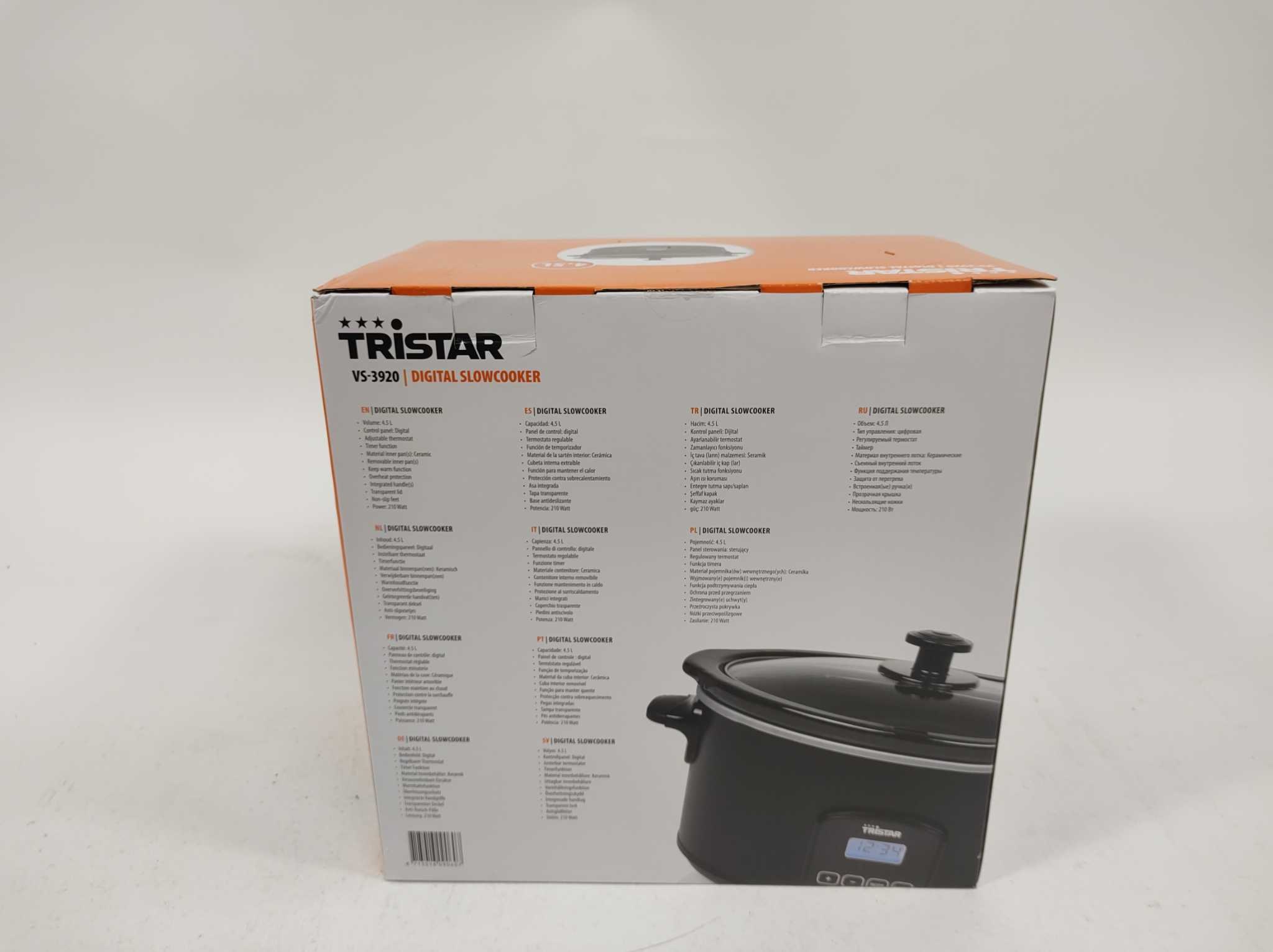 Tristar Slowcooker 4,5L - VS-3920 - Zwart. De Tristar VS-3920 digitale slowcooker is ideaal voor smaakvolle stoofgerechten, soepen en suddermaaltijden zonder veel moeite. Met een inhoud van 4,5 liter, 210 watt vermogen en keramische binnenpan bereid je eenvoudig gerechten voor het hele gezin. Het digitale display, de timer en warmhoudfunctie zorgen voor extra gebruiksgemak en controle tijdens het koken. Dankzij de uitneembare pan en antislipvoetjes werk je praktisch en veilig. Inclusief handleiding, zodat je direct aan de slag kunt met langzaam garen en warm serveren!