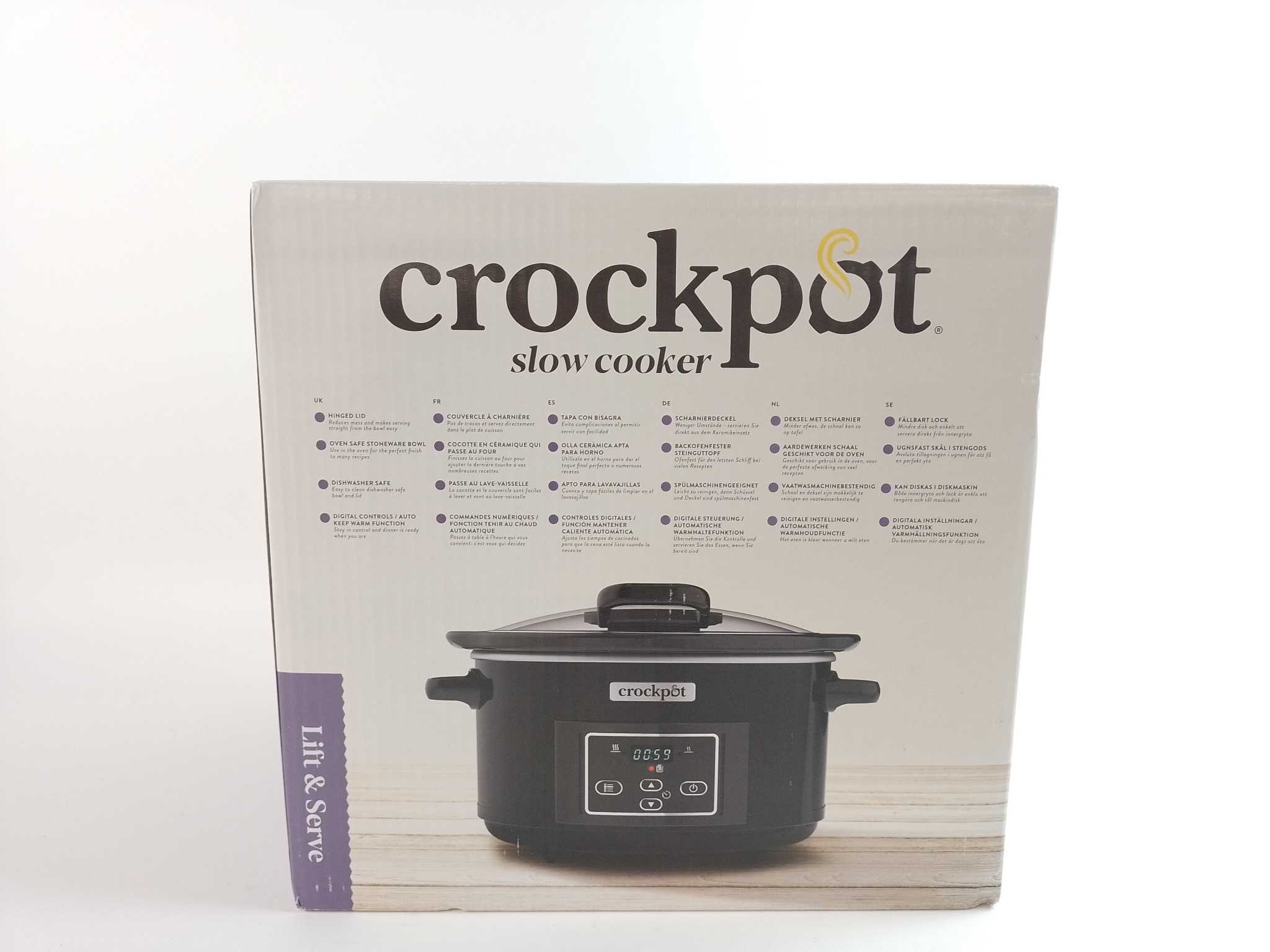 Crock-Pot Slowcooker CSC052X. De Crock-Pot CSC052X slowcooker (4,7 liter) maakt mals vlees, soepen en stoofgerechten zonder moeite. Digitaal bedieningspaneel met programmeerbare timer (30 min–20 uur) en automatische warmhoudstand. Energiezuinig 220 W en g