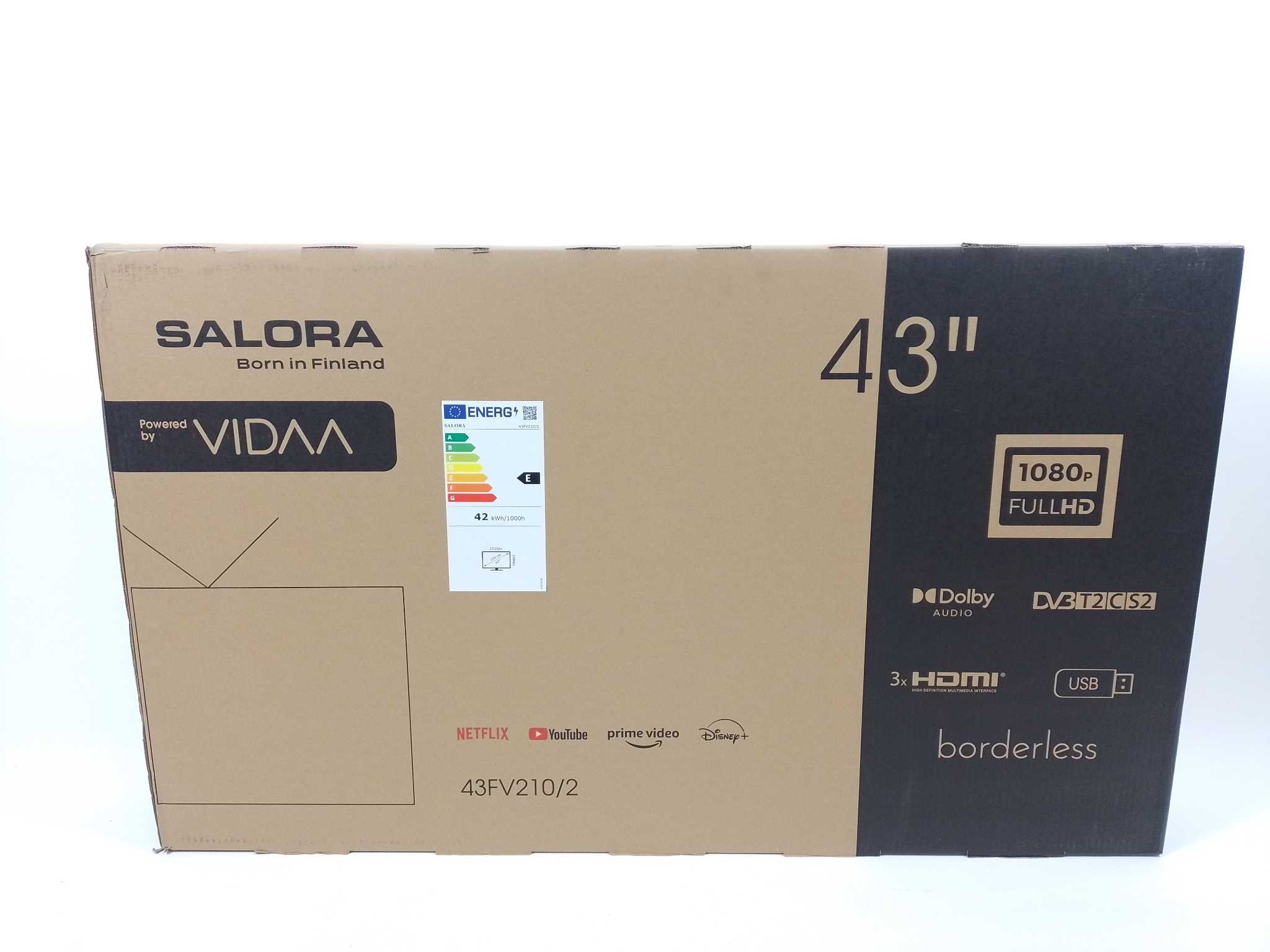 Salora Smart TV 43" - Full HD LED - 43FV210. De Salora 43FV210 is een 43 inch Full HD smart tv met VIDAA voor snelle toegang tot Netflix, YouTube en Prime Video. Dankzij 3 HDMI, 2 USB, Wi-Fi en Ethernet sluit je moeiteloos console, soundbar en opslag aan. CI+ en optische uitgang bieden flexibele ontvangst en audio. Slank design met VESA 100×100 past in elke woonkamer. Meegeleverd: tv, afstandsbediening en handleiding. Ideaal voor haarscherp streamen, tv-kijken en gamen op korte kijkafstand. Energieklasse E en 50 Hz verversing voor dagelijks kijkplezier.