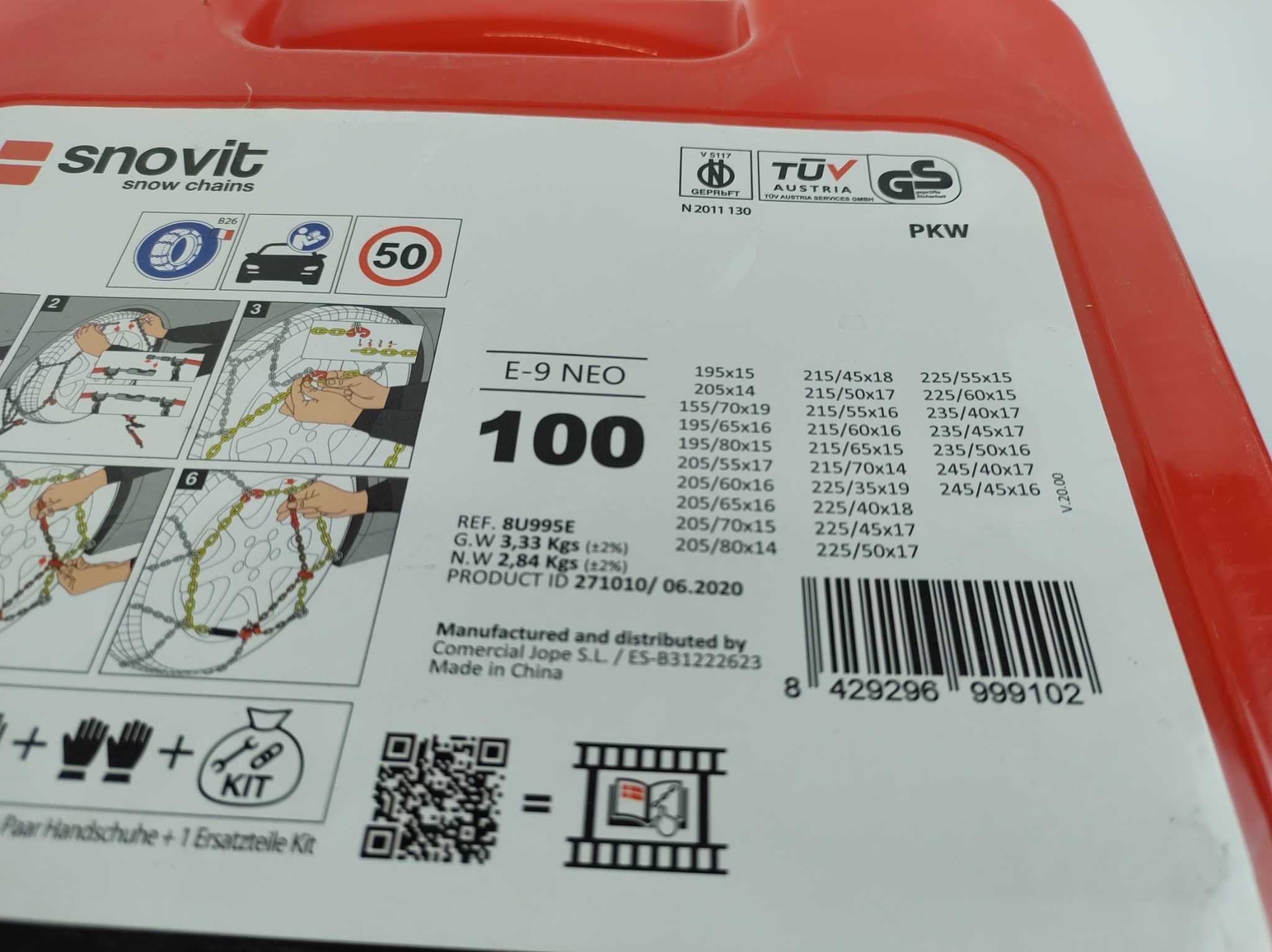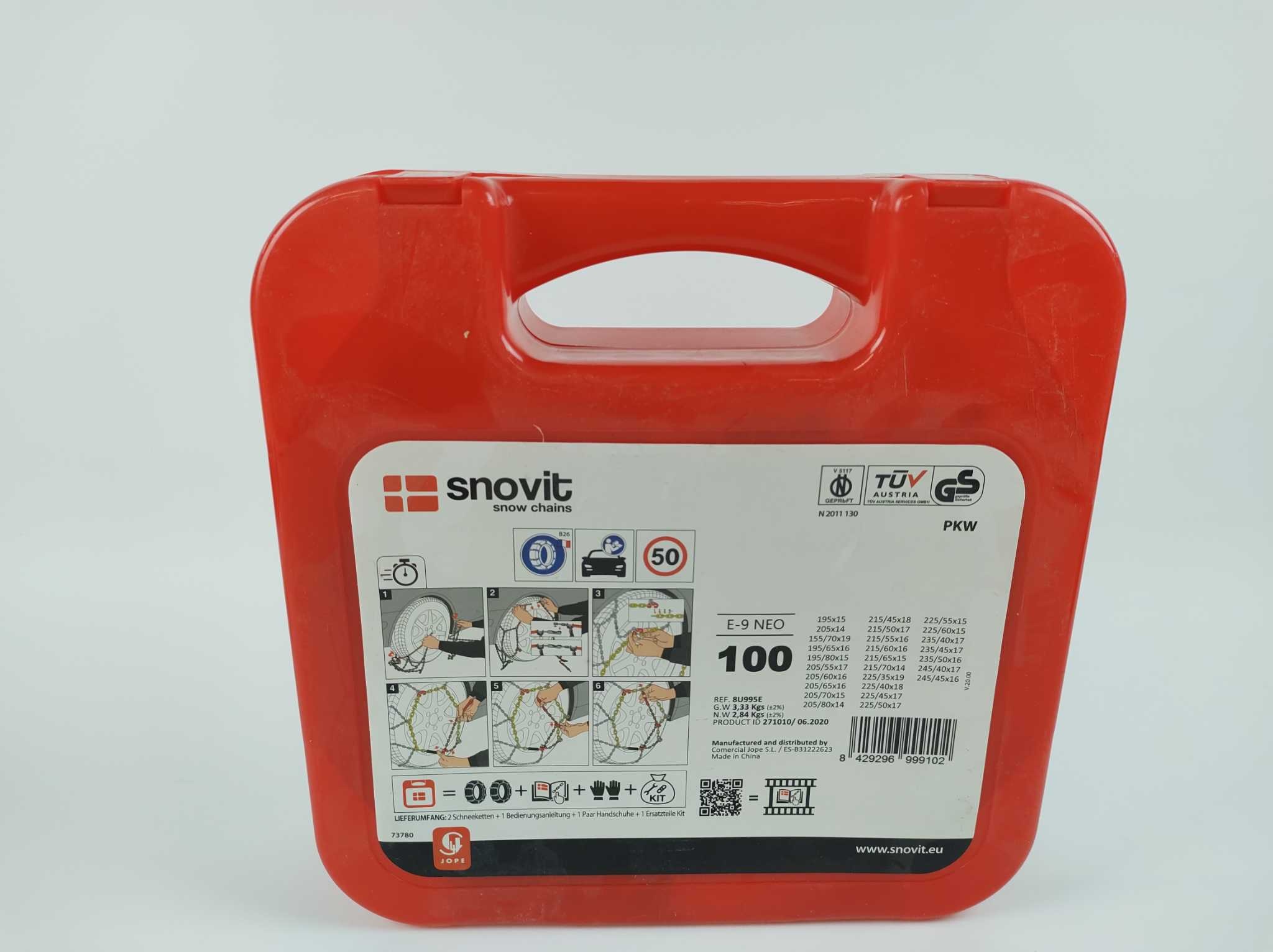 Snovit Sneeuwkettingen E9/100 NEO. Rij veilig op sneeuw en ijs met de Snovit E9100 Jope Neo sneeuwkettingen voor personenauto’s. Het diamantprofiel van gehard staal biedt optimale tractie, korte remwegen en nauwkeurige stuurcontrole. Slank 9-mm ontwerp past ook in smalle wielkasten. Eenvoudig monteren dankzij kleurcodering en zelfspannende sluiting; demontage gaat net zo snel. Geschikt voor voor- én achterwielaandrijving. Meegeleverd: 2 kettingen, stevige draagtas, montagehandschoenen en Nederlandstalige handleiding. Ideaal voor wintersport en bergpassen; voldoet aan lokale kettingplicht waar van toepassing. Compatibel met ABS/ESP tot 50 km/u.