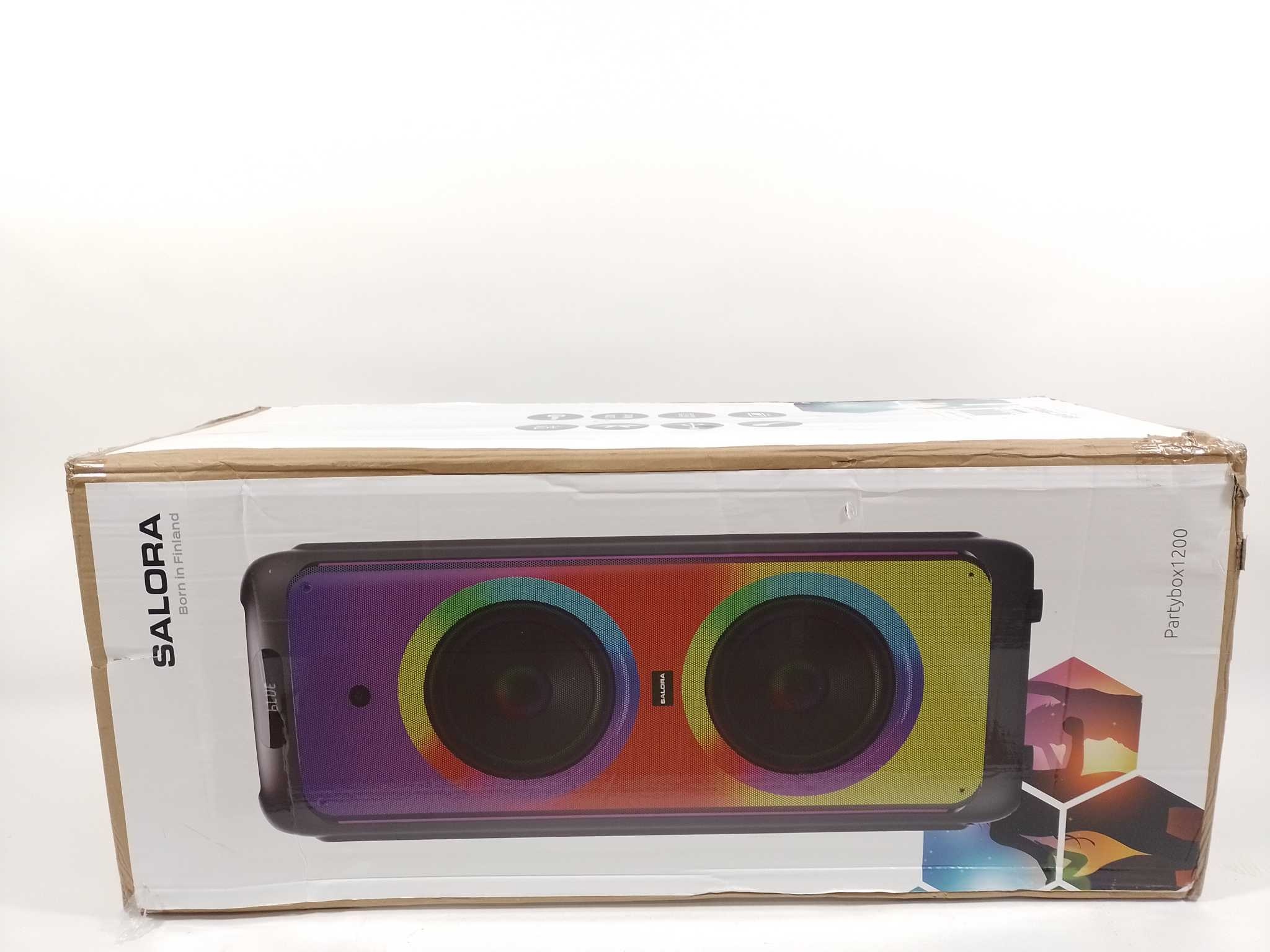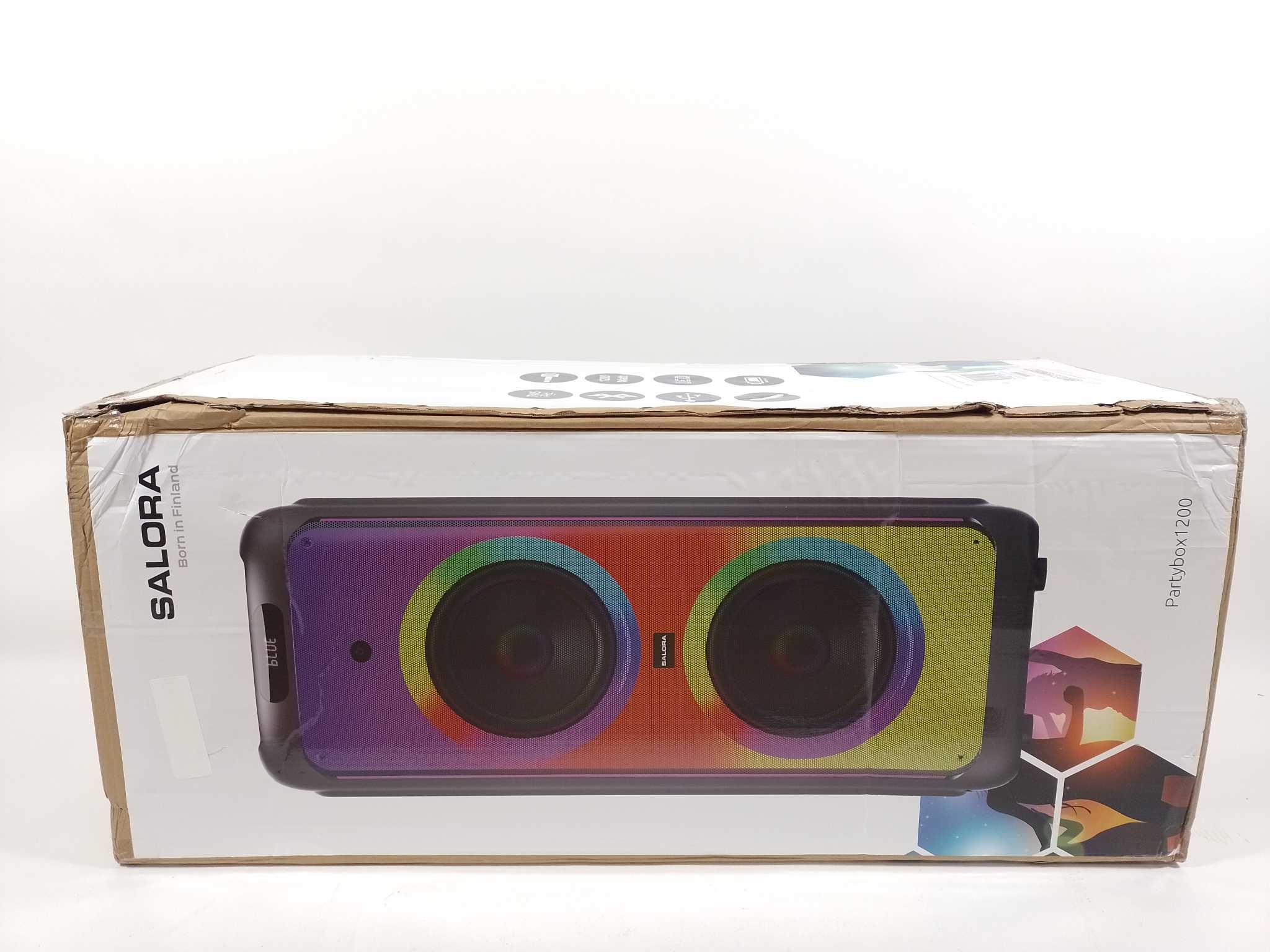 Salora Speaker Partybox 1200. Deze Salora PARTYBOX1200 Party Speaker levert een indrukwekkend geluid met een vermogen van 1200 W, verspreid over twee krachtige 12-inch speakers. De meegeleverde LED-verlichting (adaptief op muziek) zorgt voor de juiste fee