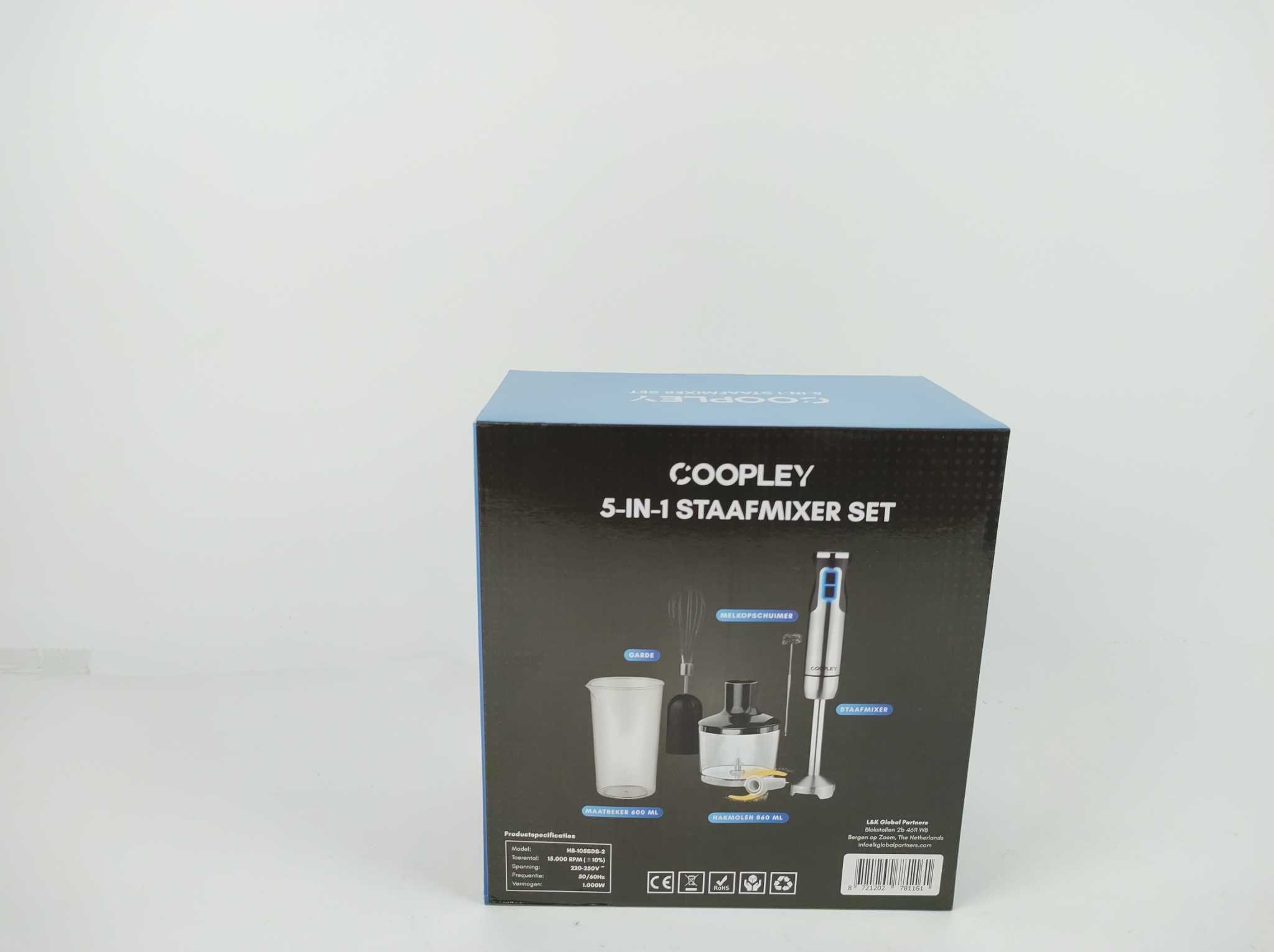 Coopley Staafmixer Set 6-in-1 - Titanforce. De Coopley Titanforce staafmixer set is een krachtige alleskunner voor elke keuken. Met 1000 watt vermogen, 12 snelheden en turbofunctie mix, pureer, hak en klop je moeiteloos uiteenlopende ingrediënten. Het siliconen handvat biedt extra grip, terwijl de titanium messen zorgen voor snel en gelijkmatig resultaat. Ideaal voor smoothies, soepen, sauzen en slagroom. Inclusief 860 ml hakmolen, melkopschuimer, garde en 600 ml maatbeker, zodat je direct veelzijdig aan de slag gaat bij elke bereiding, zonder gedoe in drukke en creatieve keukens.