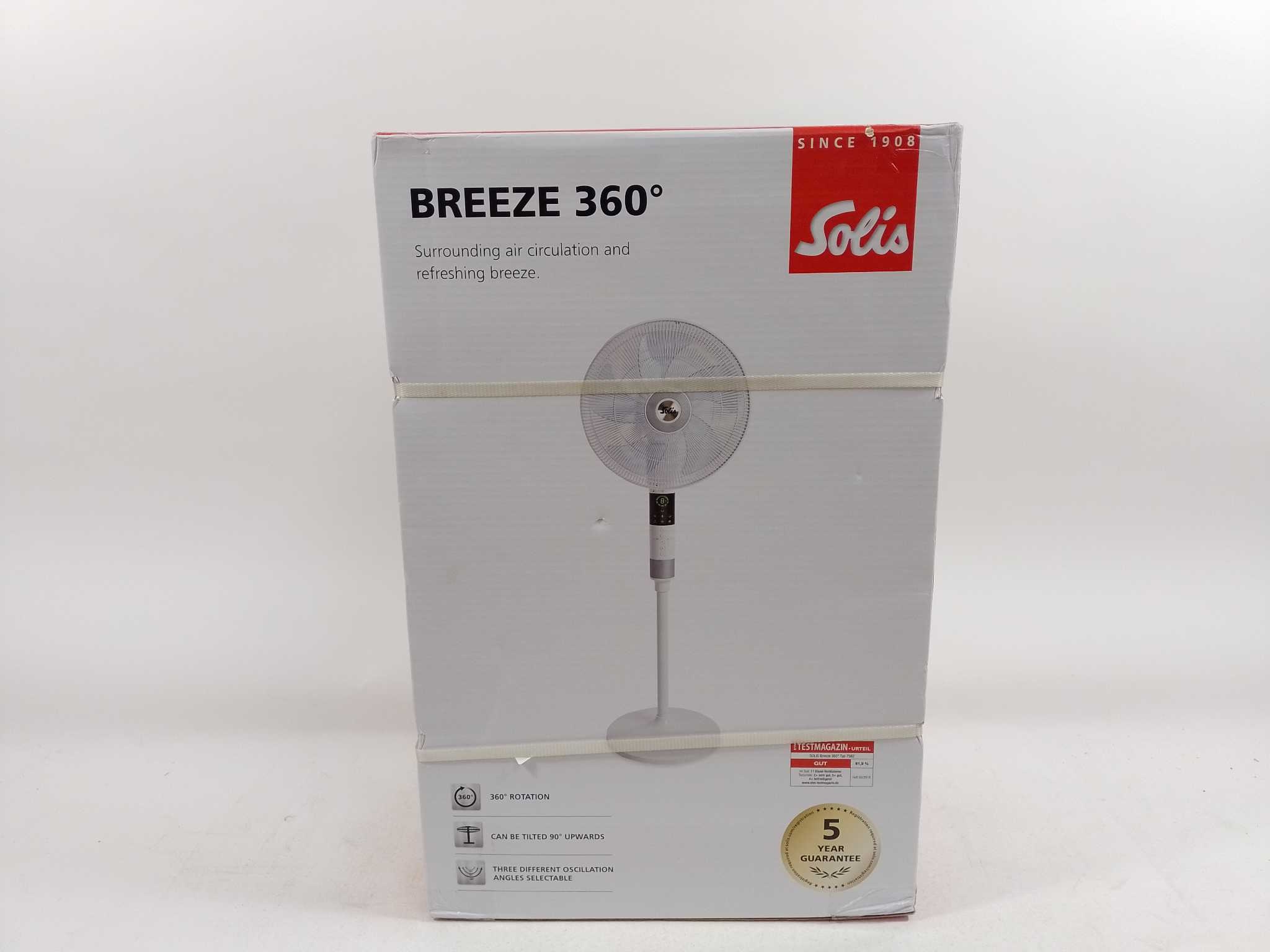 Solis Statiefventilator Breeze 360° - Wit. De Solis Breeze 360° statiefventilator levert krachtige verkoeling met 65 W, 40 cm bladdiameter en instelbare oscillatie van 60°, 90°, 180° of volledige 360°. Kies uit 3 snelheden en 3 modi (Normaal, Natuur, Slaa