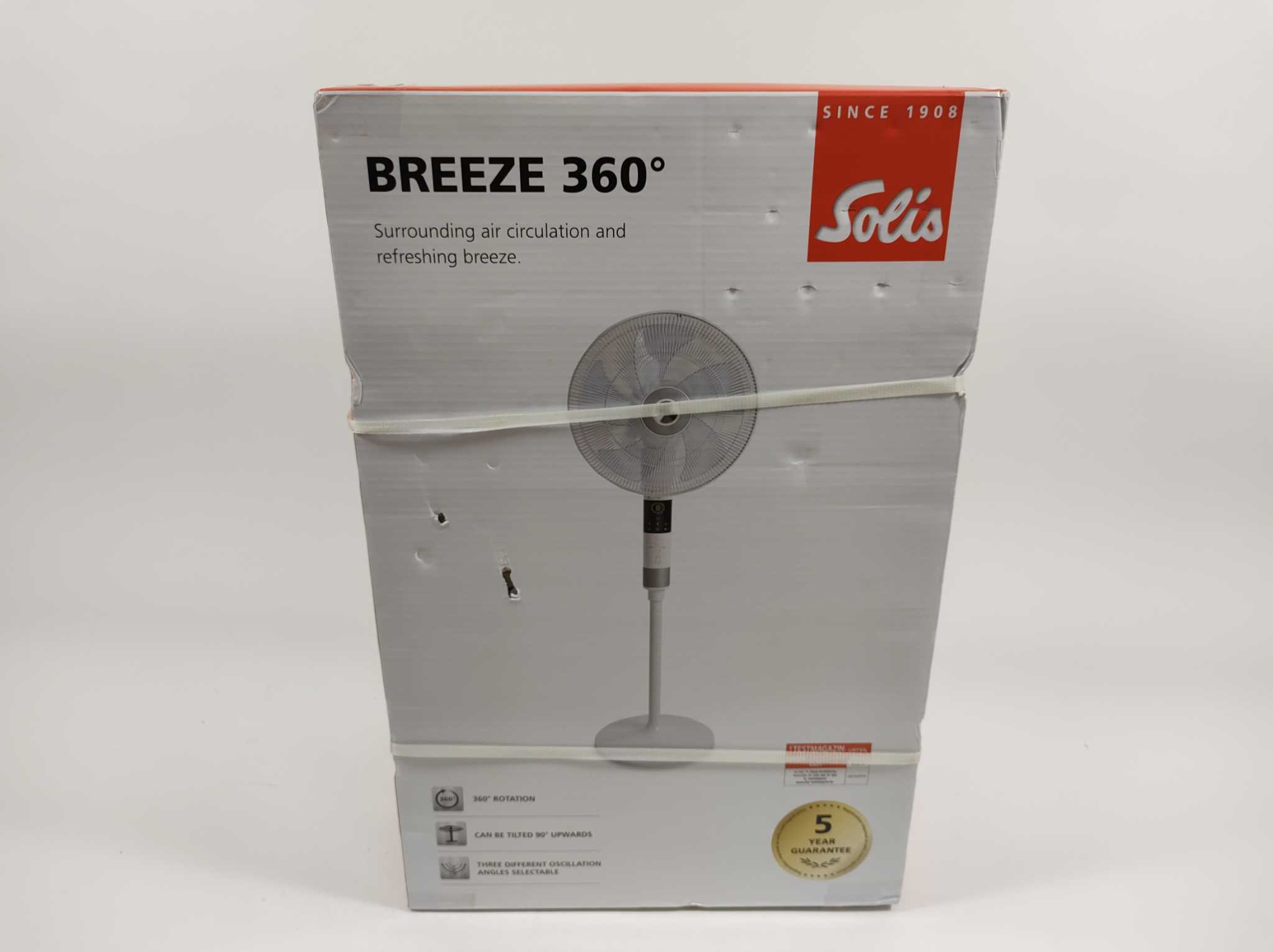 Solis Statiefventilator Breeze 360° - Wit. De Solis Breeze 360° statiefventilator levert krachtige verkoeling met 65 W, 40 cm bladdiameter en instelbare oscillatie van 60°, 90°, 180° of volledige 360°. Kies uit 3 snelheden en 3 modi (Normaal, Natuur, Slaa