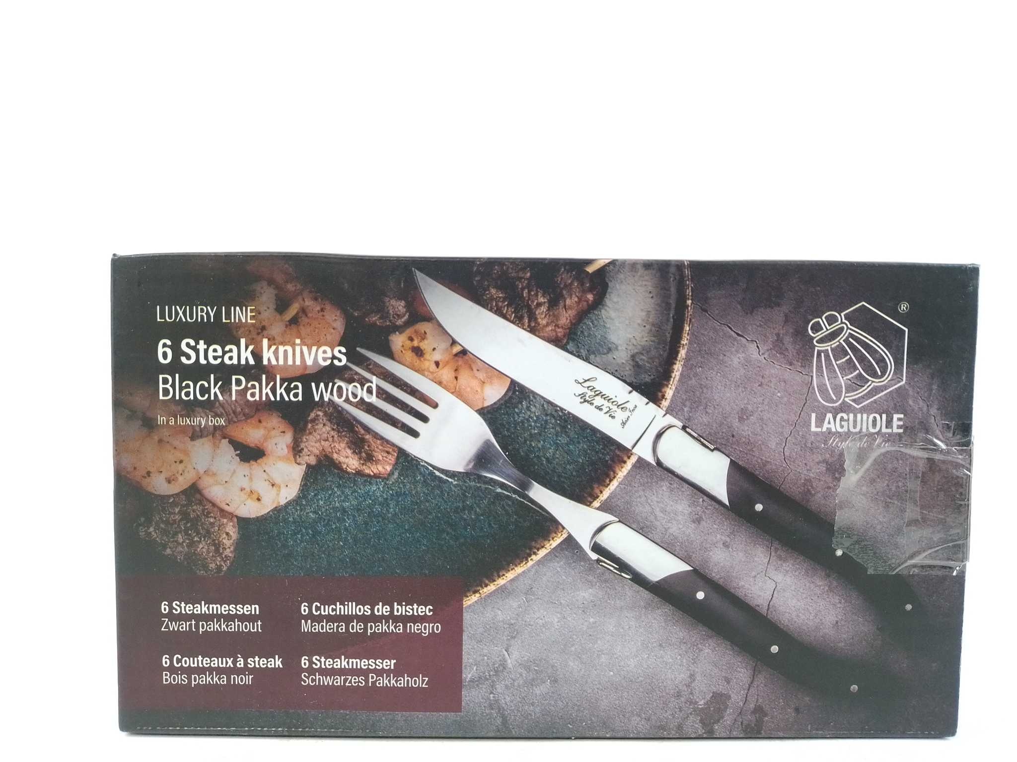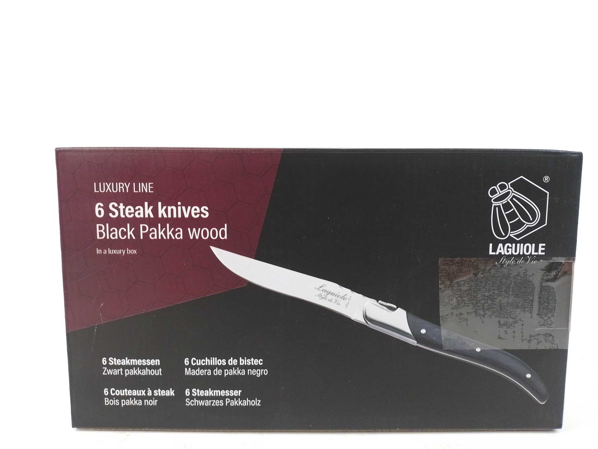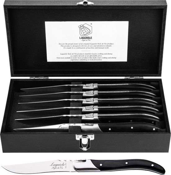 Laguiole Style de Vie Steakmessen Luxury Line - 6-delig. Geniet van perfect gesneden steak met de Laguiole Style de Vie Luxury Line steakmessenset (6-delig) met zwart ebbenhouten handvat. Het gladde, vlijmscherpe roestvrijstalen lemmet van 10 cm en 2,5 mm dikte glijdt moeiteloos door vlees, kip en gegrilde groenten. De ergonomische handgreep ligt stevig in de hand en geeft je tafel een luxe uitstraling. Ideaal voor barbecue, diner en tapas. Geleverd in een stijlvolle houten geschenkkist. Niet vaatwasbestendig; met de herkenbare Laguiole-look is dit ook een prachtig cadeau voor foodies.