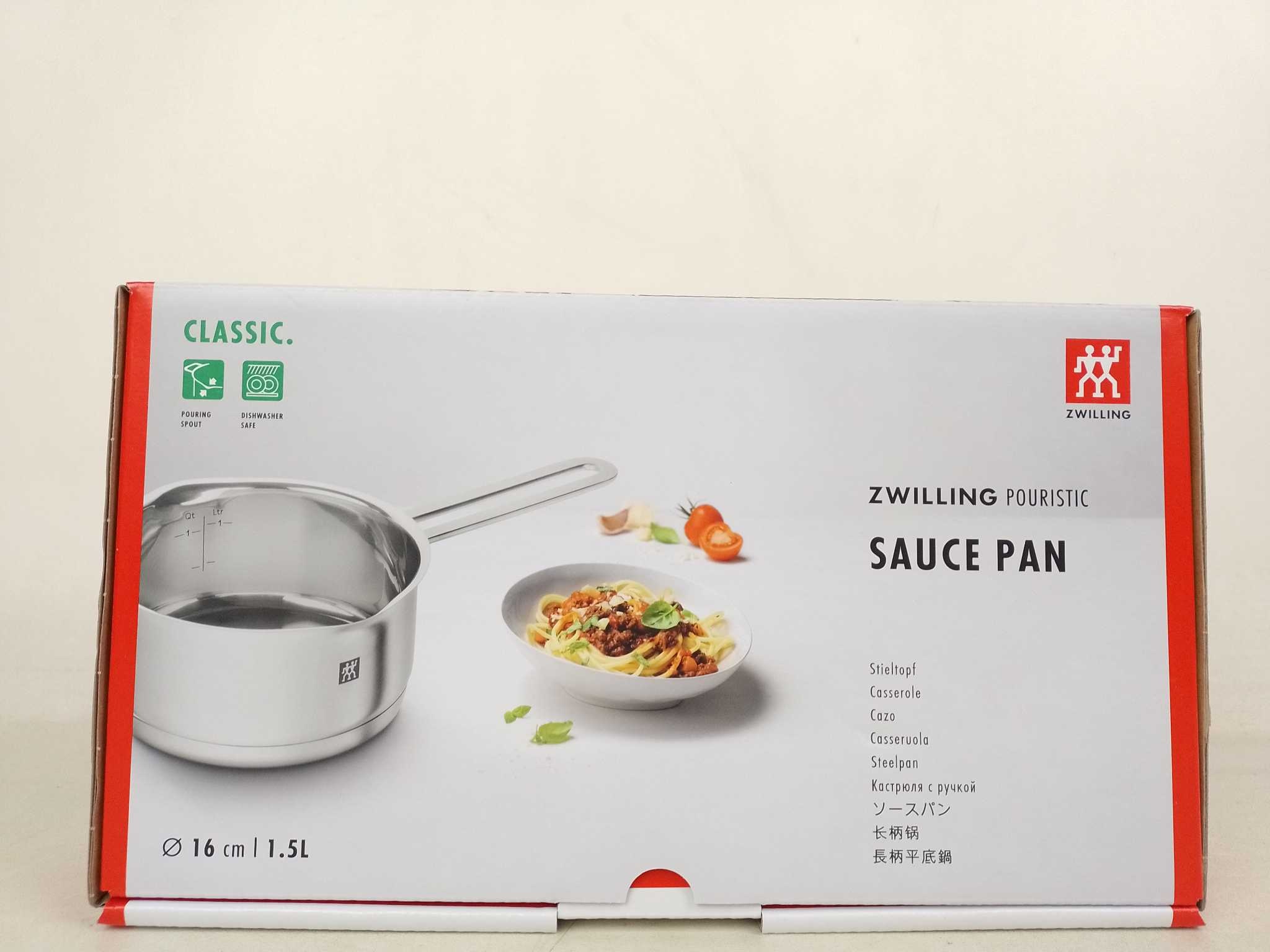 Zwilling Steelpan Pouristic - 16 cm. De Zwilling Pouristic steelpan 16 cm van 18/10 roestvrij staal is ideaal voor sauzen, pap en kleine porties. De SIGMA Classic+ sandwichbodem met aluminiumkern warmt snel en gelijkmatig op, ook op inductie. Dankzij de geïntegreerde maatverdeling meet je vloeistoffen nauwkeurig af en giet je schoon uit via de schenkrand. Vaatwasserbestendig en stevig met comfortabele handgreep. Geleverd als losse steelpan zonder deksel, klaar voor dagelijks koken. Het tijdloze, glanzende design past in elke keuken en bespaart energie door efficiënte warmteoverdracht altijd.