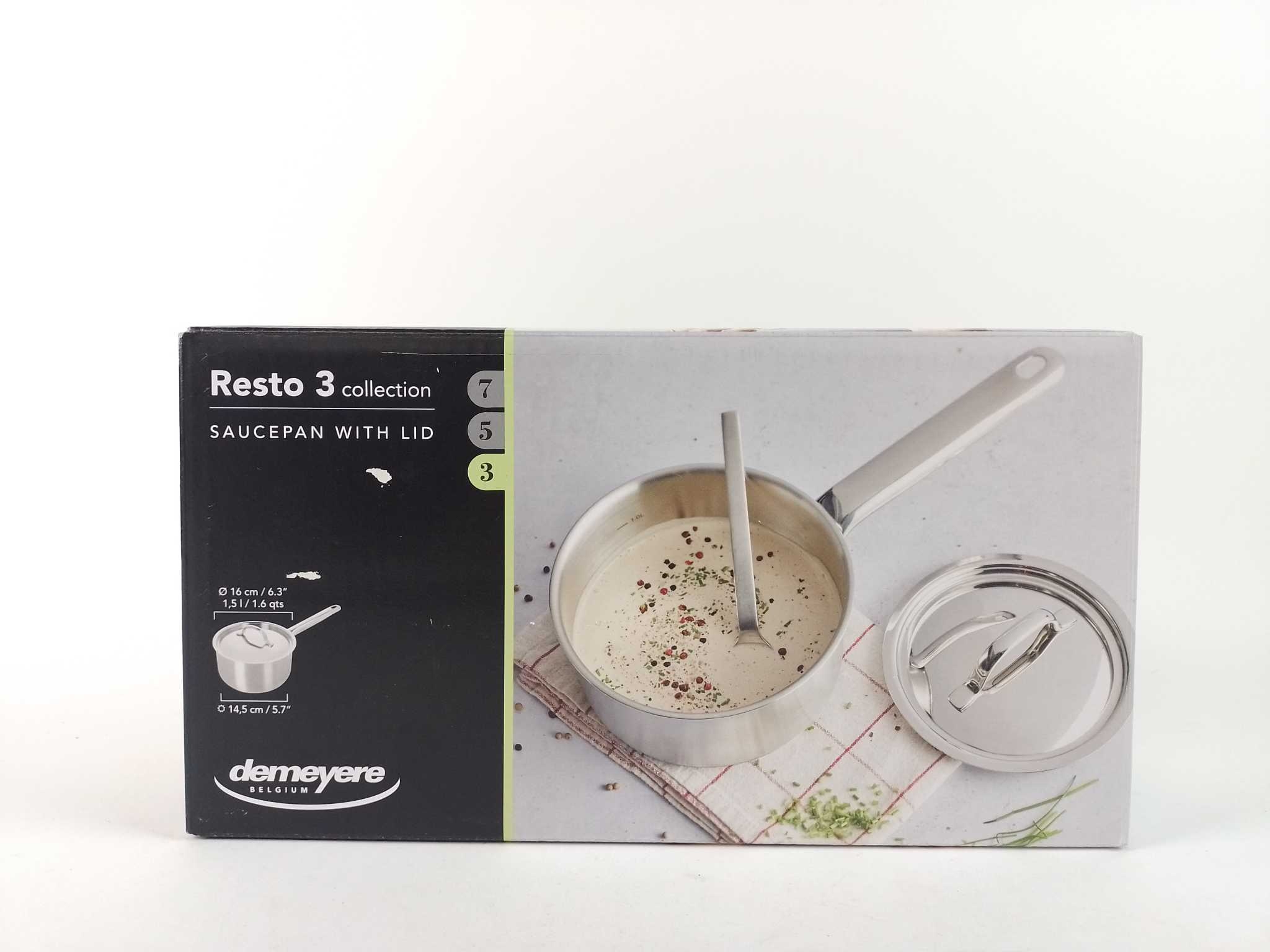 Demeyere Steelpan Resto 3 - 16 cm. Bereid sauzen en kleine porties met de Demeyere Resto 3 steelpan 16 cm (1,5 liter) met deksel. De 18/10 roestvrijstalen pan heeft een 3-lagen capsulebodem (ca. 4 mm) voor snelle, gelijkmatige warmte. Geschikt voor alle w