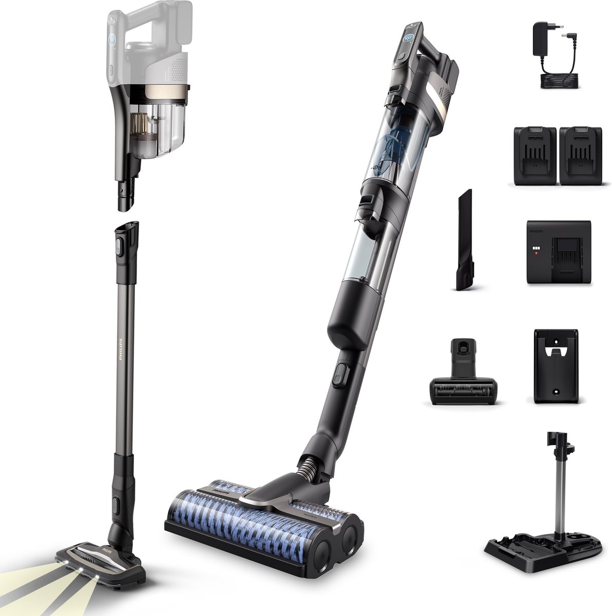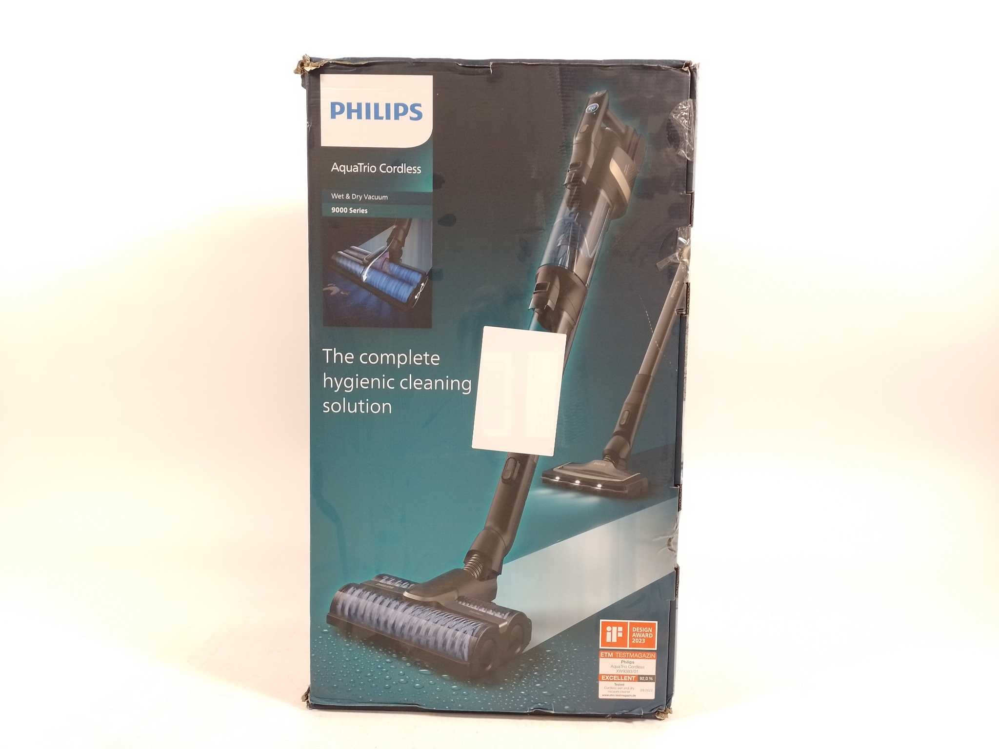 Philips Steelstofzuiger - AquaTrio XW9385/01. De Philips AquaTrio Cordless XW9385/01 is een veelzijdige 3-in-1 steelstofzuiger die stofzuigen, dweilen en drogen combineert. Dankzij het AquaSpin-mondstuk en de zelfreinigende microvezelborstels verwijdert hij tot 99,9% van bacteriën en vuil in één beweging. De krachtige lithium-ionbatterij biedt tot 90 minuten gebruikstijd met de meegeleverde extra accu. Met LED-verlichting op de zuigmond, een digitaal LCD-scherm en automatische zelfreiniging is hij gebruiksvriendelijk en efficiënt. Ideaal voor harde vloeren en huishoudens die gemak en hygiëne waarderen. Philips 9000 Series. Gebruikstijd stofzuiger en dweil standaardmodus: 25 minuten. Gebruikstijd alleen stofzuiger standaardmodus: 45 minuten. Gebruikstijd alleen stofzuiger turbomodus: 25 minuten. Oplaadtijd: 4 uur. Luchtsnelheid (max.): 840 l/min. Batterijvoltage: 25,2 V. k3-in-1 snoerloze steelstofzuiger & dweil met extra verwisselbare accu (XW9385/01). Kleur: zwart. Geluidsniveau: 83 dB. Voedingstype: Accu. Gewicht: 4.20 kg. Indicatielampje: Ja. Muur montage: Nee. Dweilfunctie: Stofzuiger met dweilfunctie. Draadloos: Ja. Product breedte: 27 cm.