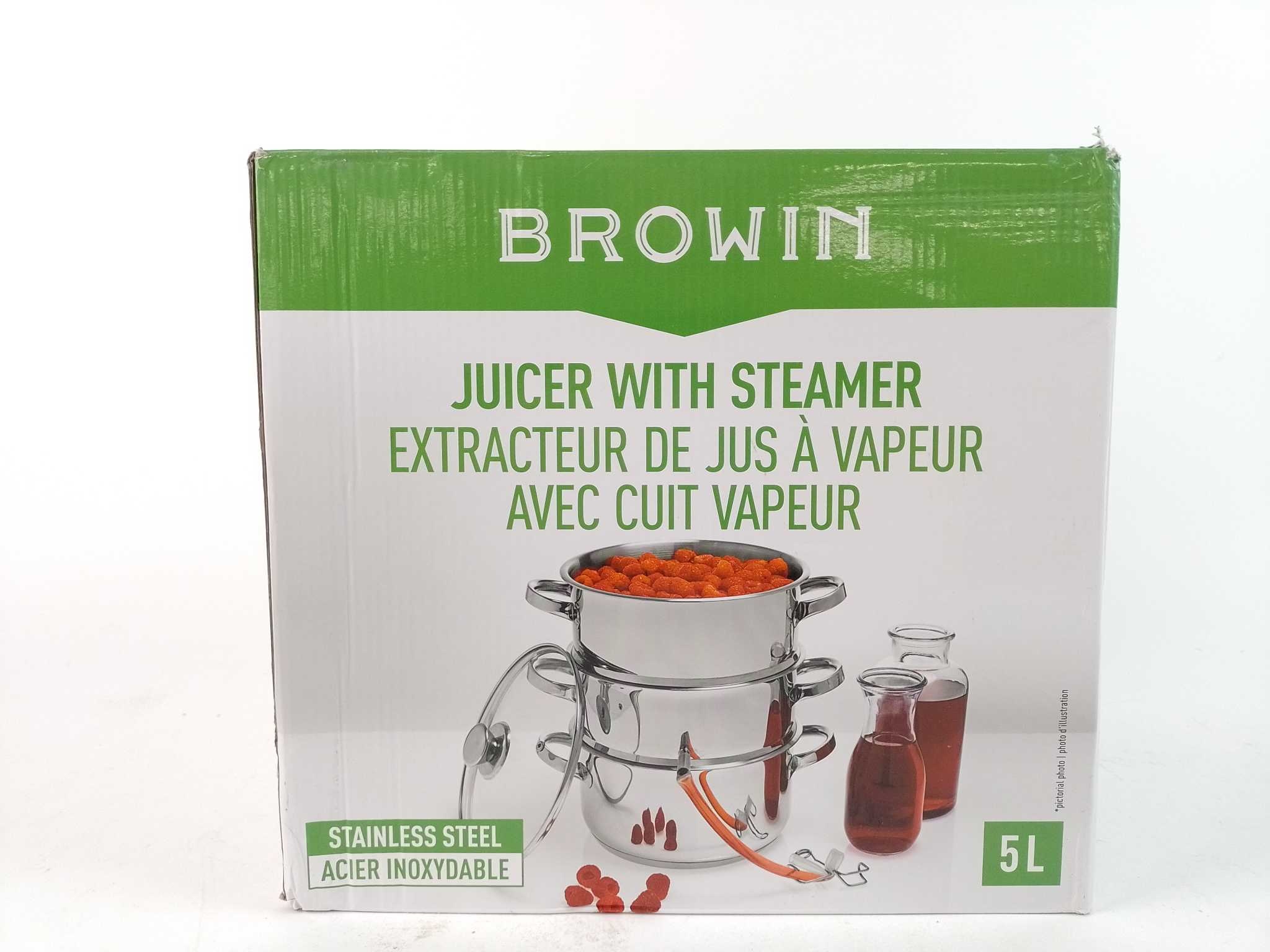Browin Stoomextractor met Stoomkoker 5L. Maak moeiteloos helder fruit- en groentesap met de Browin roestvrijstalen stoomextractor 5 liter. Dit 2-in-1 systeem werkt als sapmaker én stoomkoker, ideaal voor appel, bes, druif of tomaat. De hittebestendige RVS