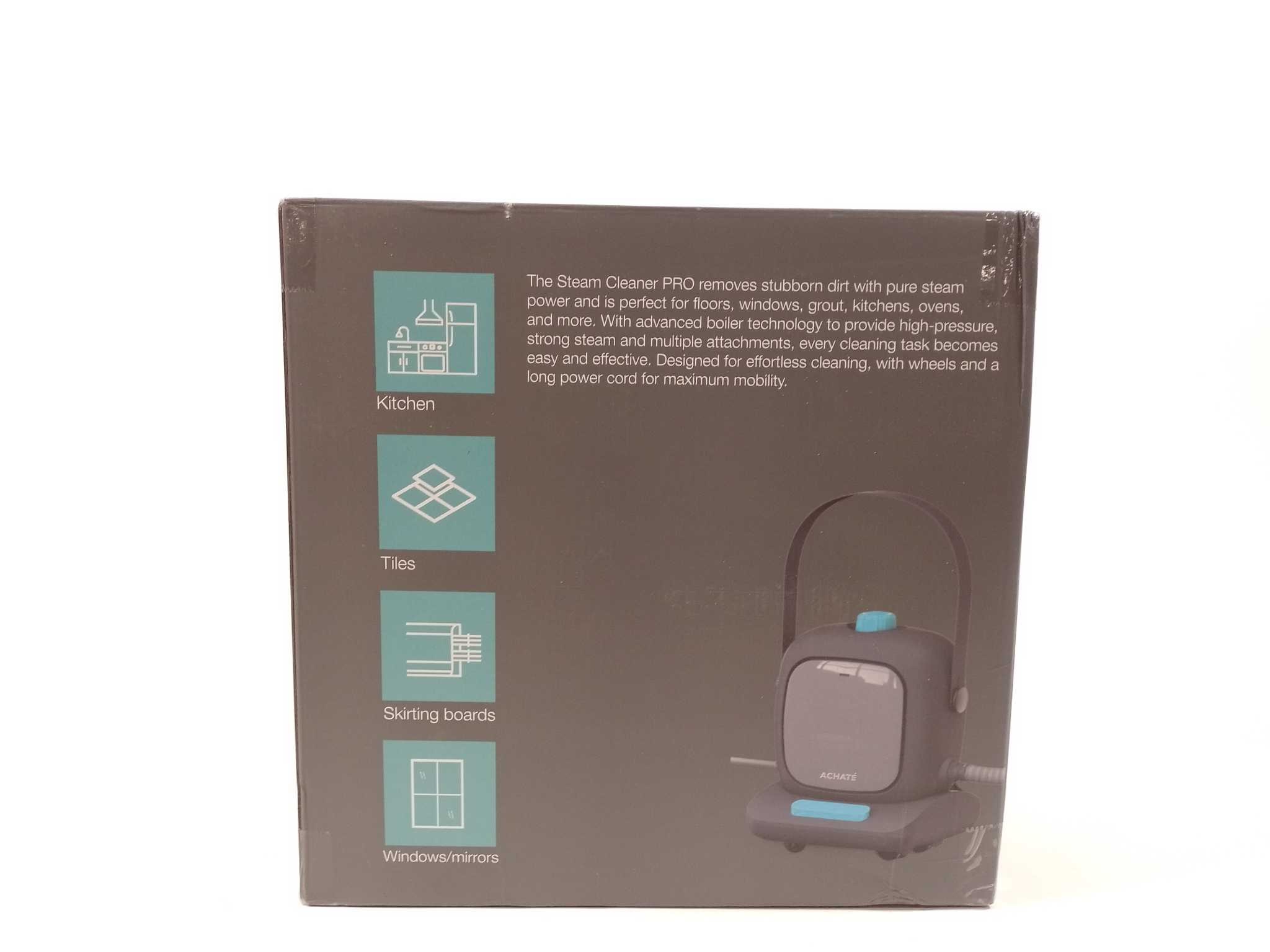 Achaté Stoomreiniger Pro. Maak chemievrij schoon met de Achaté Stoomreiniger Pro. Met 1500W vermogen, 800 ml watertank en 3 minuten opwarmtijd verwijdert hij vuil, vet en bacteriën op vloeren, tegels, ramen, meubels en voegen. Tot 45 minuten continue stoo