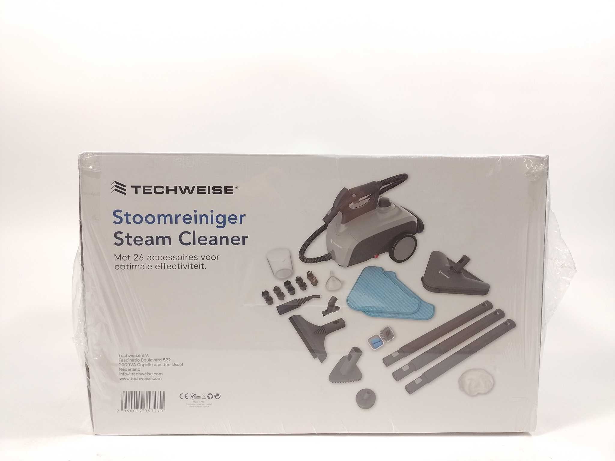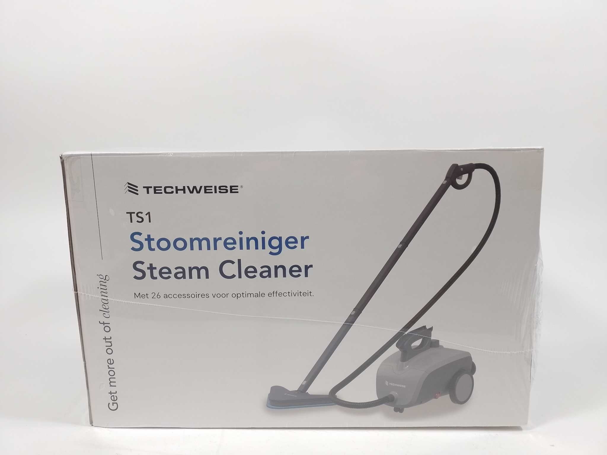Techweise Stoomreiniger TS1 - Grijs. De Techweise TS1 is een krachtige 16-in-1 stoomreiniger met een 1,5 liter waterreservoir en een stoomdruk van 4 bar. Met een gebruiksduur van 45 minuten en een opwarmtijd van slechts enkele minuten is hij ideaal voor het reinigen van diverse oppervlakken zoals vloeren, tapijten, ramen en textiel. De set wordt geleverd met 16 accessoires, waaronder borstels, sproeiers en doeken, voor veelzijdig gebruik. Dankzij de 5 meter lange kabel en het compacte ontwerp is de stoomreiniger eenvoudig in gebruik en op te bergen. Perfect voor grondige reiniging zonder chemicaliën. Vermogen: 1500 W. Oplaadtijd: 8 minuut. Opwarmtijd stoom: 500 seconde. Snoerlengte: 5 m. Aantal warmtestanden: 1. Aantal waterreservoirs: 1. Gebruiksduur met vol waterreservoir: 45 minuut.