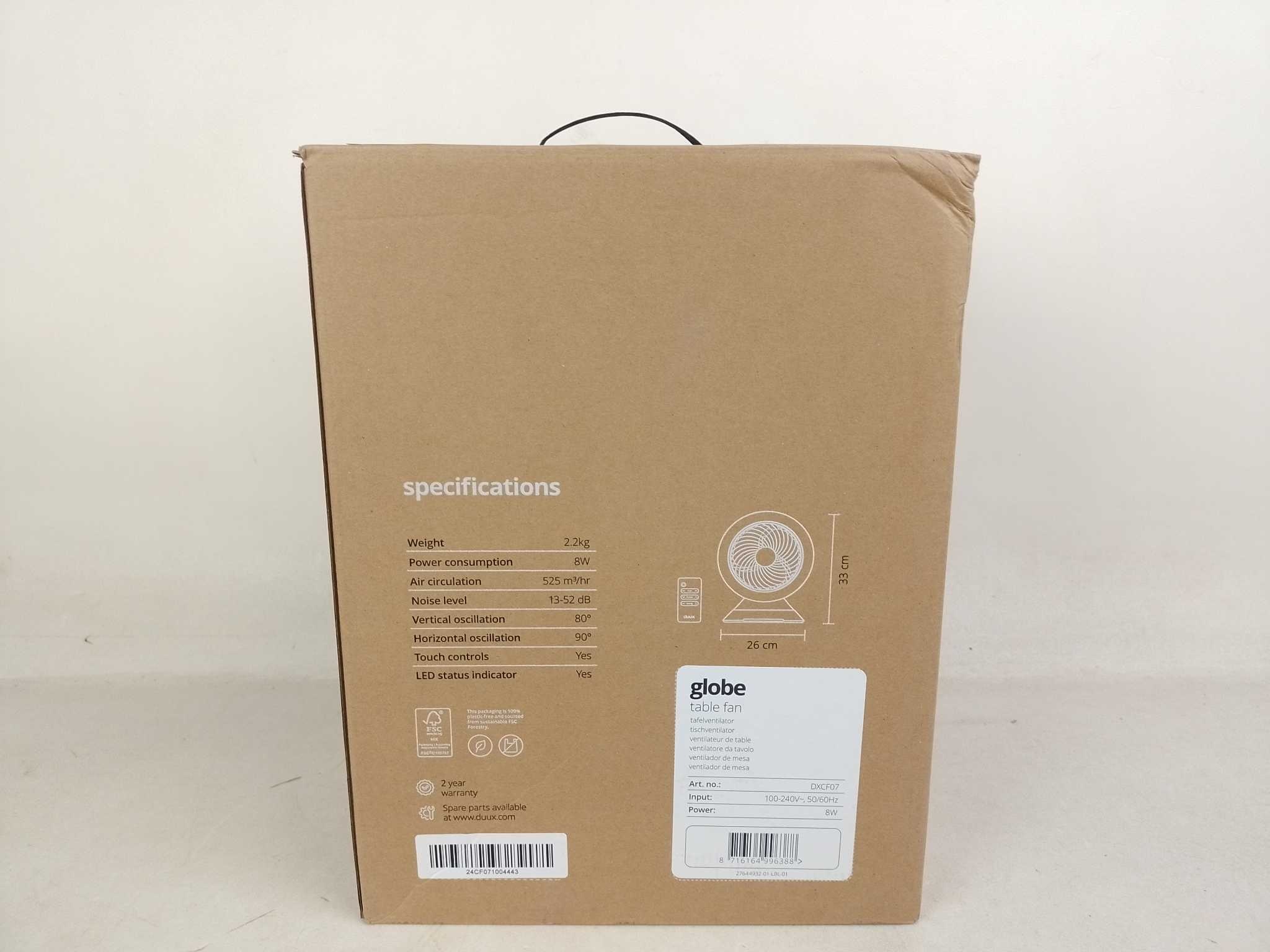 Duux Tafelventilator Globe - Zwart. De Duux Globe tafelventilator in zwart levert krachtige, fluisterstille koeling dankzij een efficiënte DC-motor. Met 3 snelheden, 90° horizontale en 80° verticale oscillatie circuleert hij lucht tot 7 meter ver, ideaal voor bureau, keuken of slaapkamer. Touchbediening en timer (1/3 uur) maken gebruik eenvoudig. Compact design met kantelbare kop voor gerichte verkoeling. Inclusief afstandsbediening en netadapter. Energiezuinig (2–8 W) en kindervriendelijk rooster. Een stijlvolle, moderne ventilator voor gericht comfort en optimale luchtcirculatie.