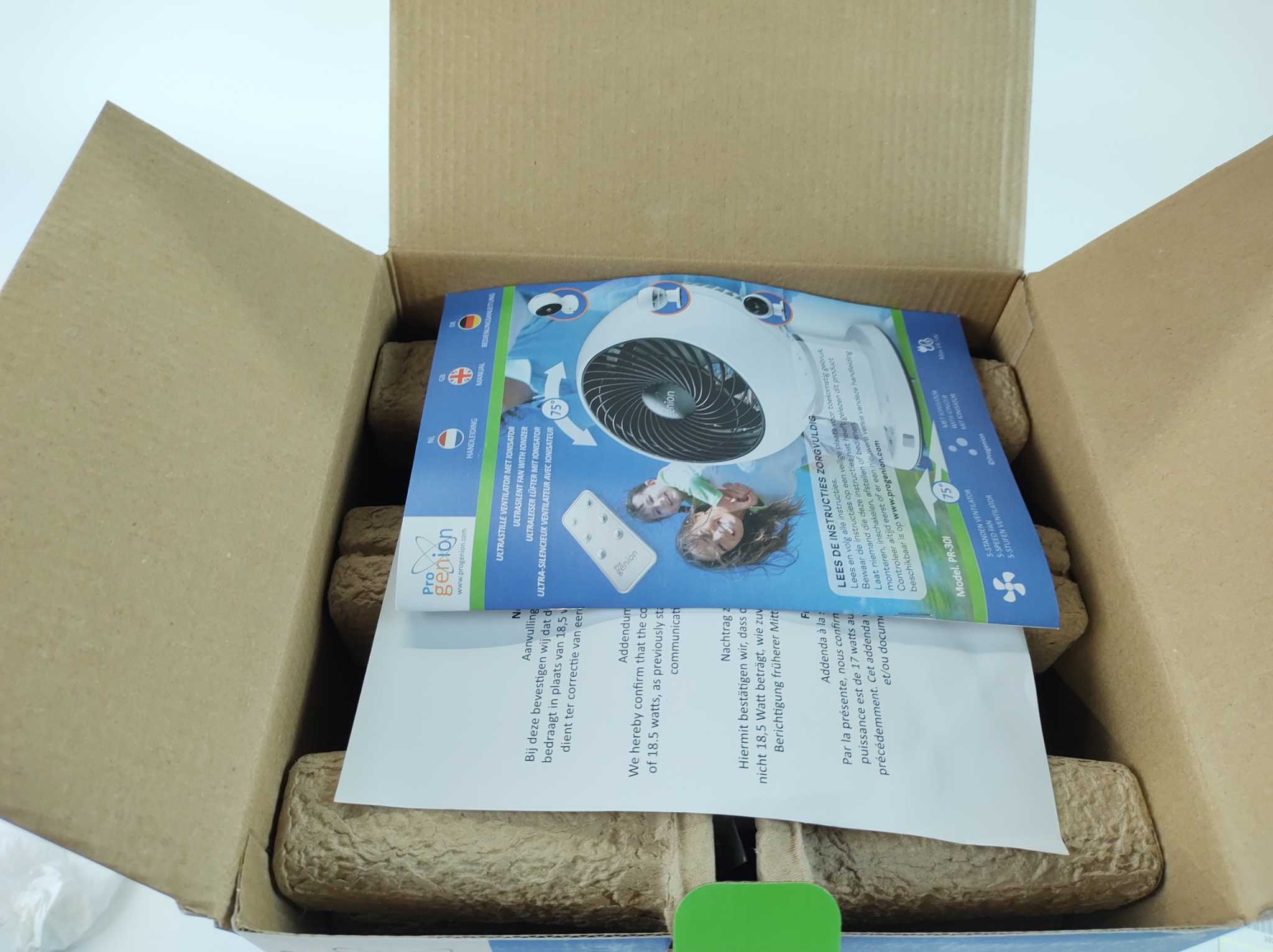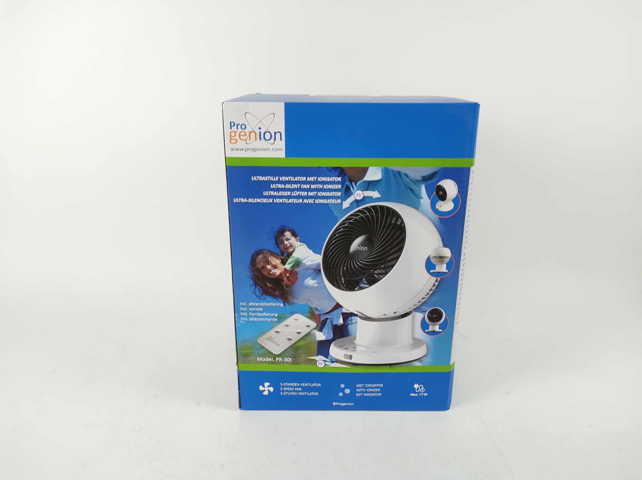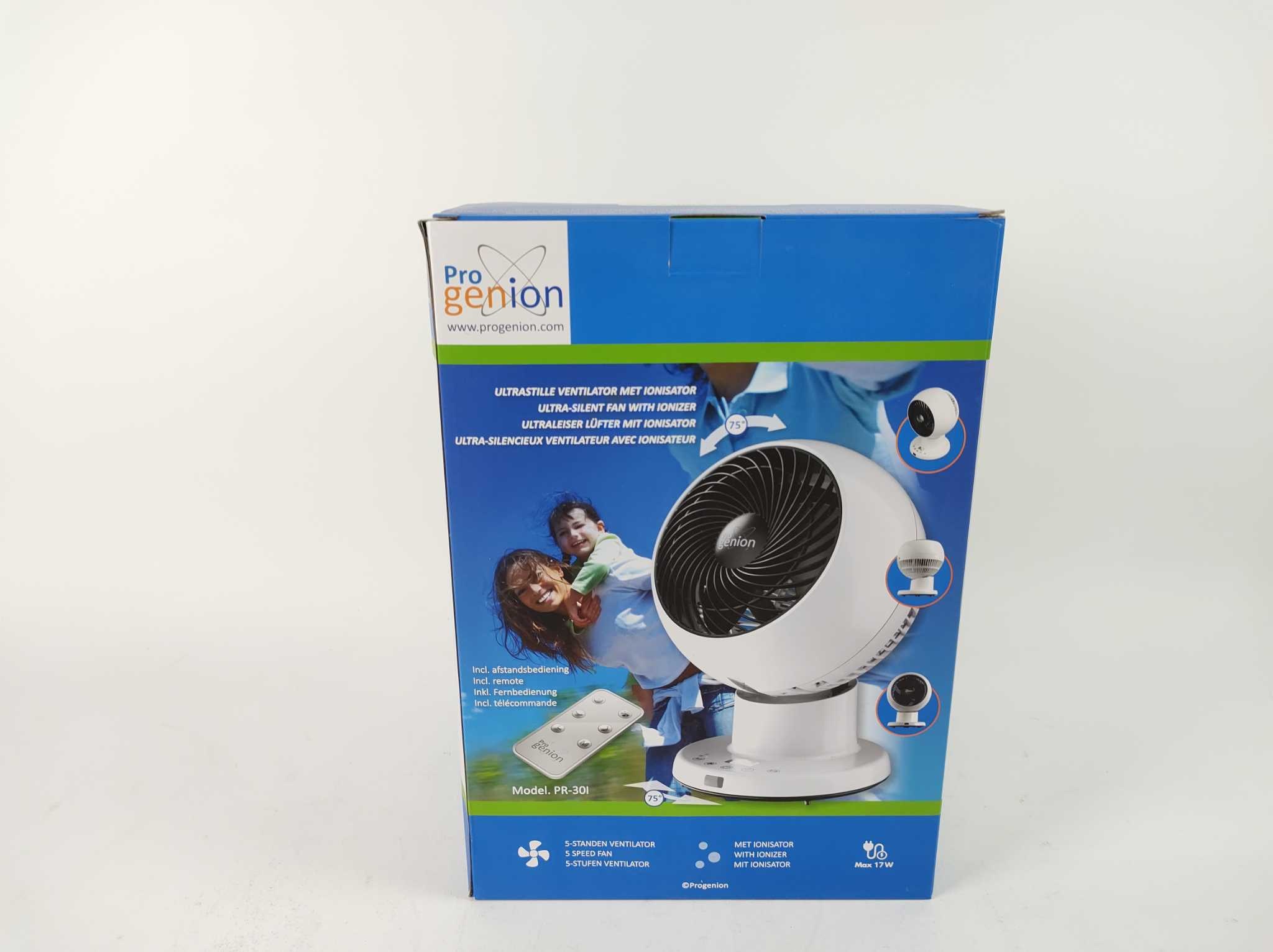 Progenion Tafelventilator PR-30I. De Progenion PR-30i is een ultra-stille tafelventilator met krachtige ionisator die lucht koelt én verfrist. Dankzij variabele snelheden, oscillatie en instelbare timer creëer je precies het binnenklimaat dat je wilt. De