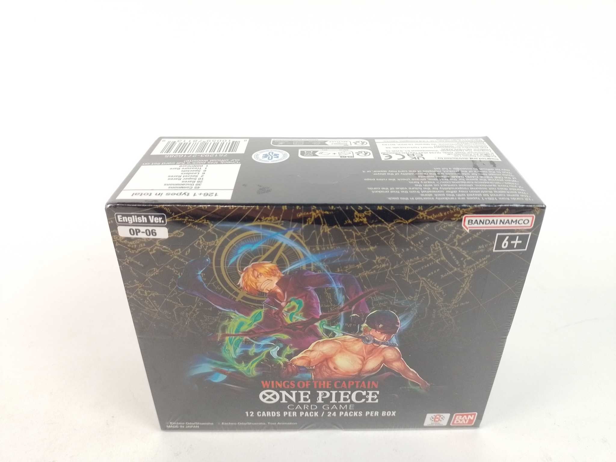One Piece Trading Cards Boosterbox - Wings Of The Captain OP6. Breid je One Piece kaartspel uit met de Wings of the Captain boosterbox OP-06 (Engels). In deze display zitten 24 boosterpacks met elk 12 kaarten, ideaal voor verzamelen, draften of deckbuilding. Ontdek nieuwe tactieken rond Zoro en Sanji en versterk je strategieën met perfecte synergie voor Starter Deck ST-12. Met thema’s als Fishman Island, Thriller Bark en Germa 66 maak je kans op Leaders, Super Rares, Secret Rares, Treasure Rare en DON!! kaarten. Verpakt in folie, klaar om te openen.