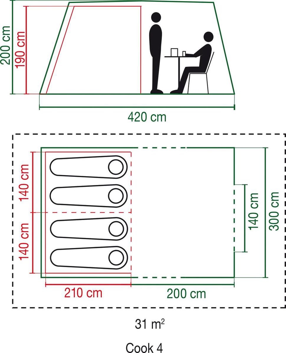 Coleman Tunneltent Cook 4 - Groen. De Coleman Cook 4 tunneltent is een ruime gezinstent voor vier personen, met een solide waterkolom van 3000 mm. De tent heeft twee slaapcabines die je met een scheidingswand kunt splitsen of samenvoegen, en een royale le