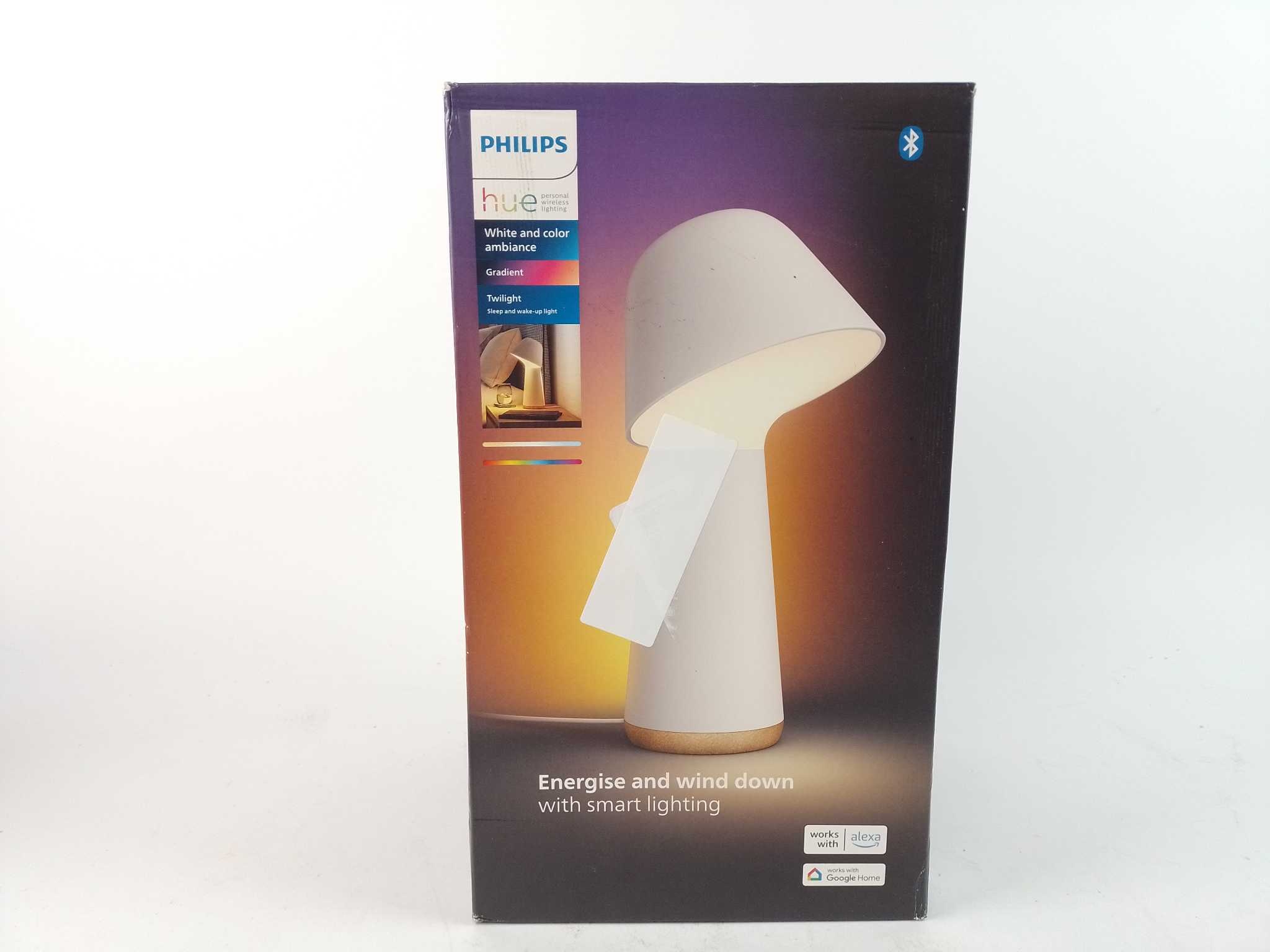 Philips Hue Twilight - Wit. Word natuurlijk wakker en val rustiger in slaap met de Philips Hue Twilight sleep & wake-up light. De dubbele lichtbron mengt wit en gekleurd licht voor een realistische zonsopgang, ultralaag dimmen en warme rode avondscènes. Stel automations, timers en slaaproutines in via de Hue app, Bluetooth of Zigbee met een Bridge. Met 1380 lumen is hij sterk genoeg als leeslamp. In de doos: Twilight lamp en voedingsadapter met 2 m kabel. Ideaal voor slaapkamer, nachtkastje en slimme verlichting in huis.