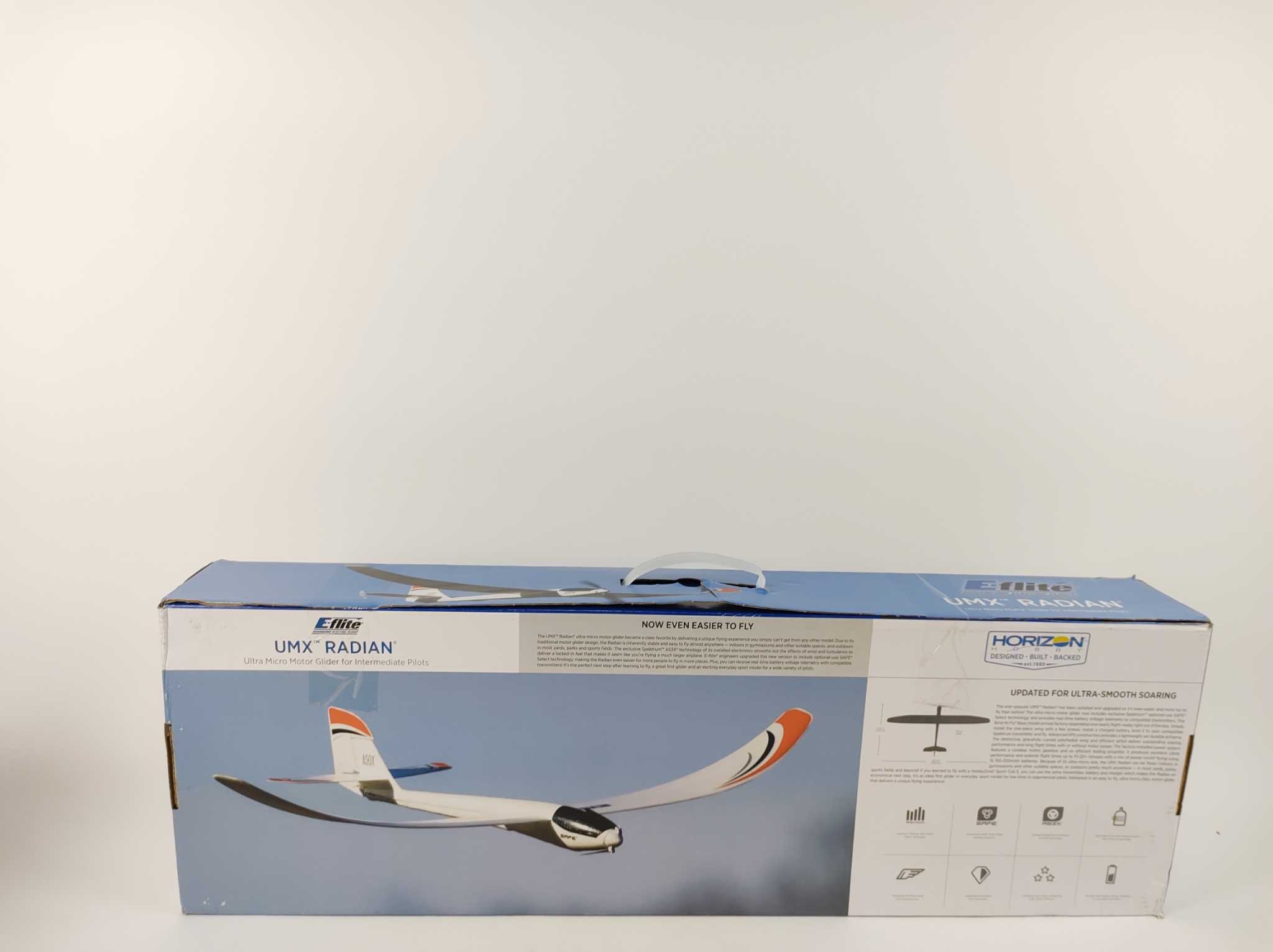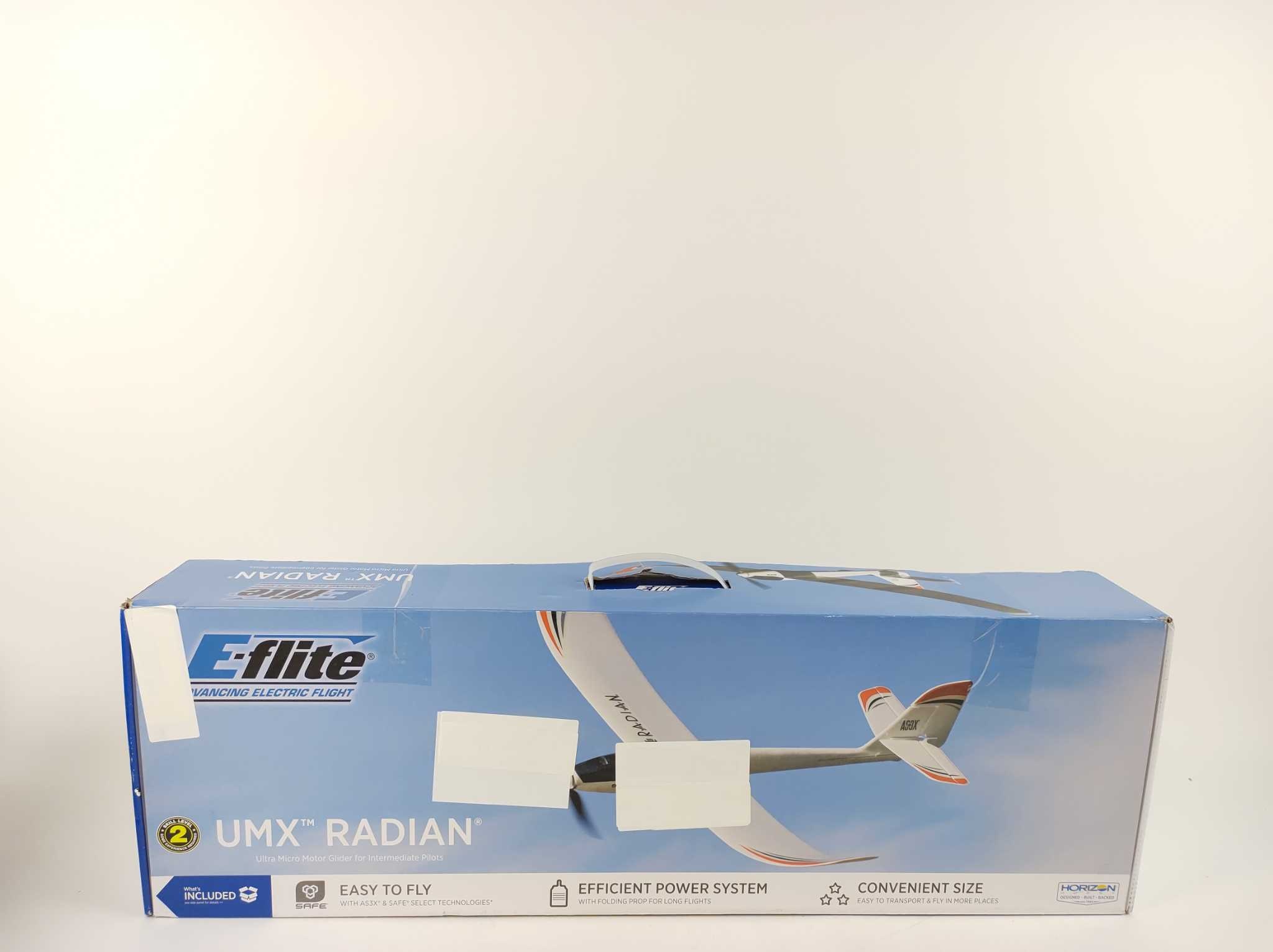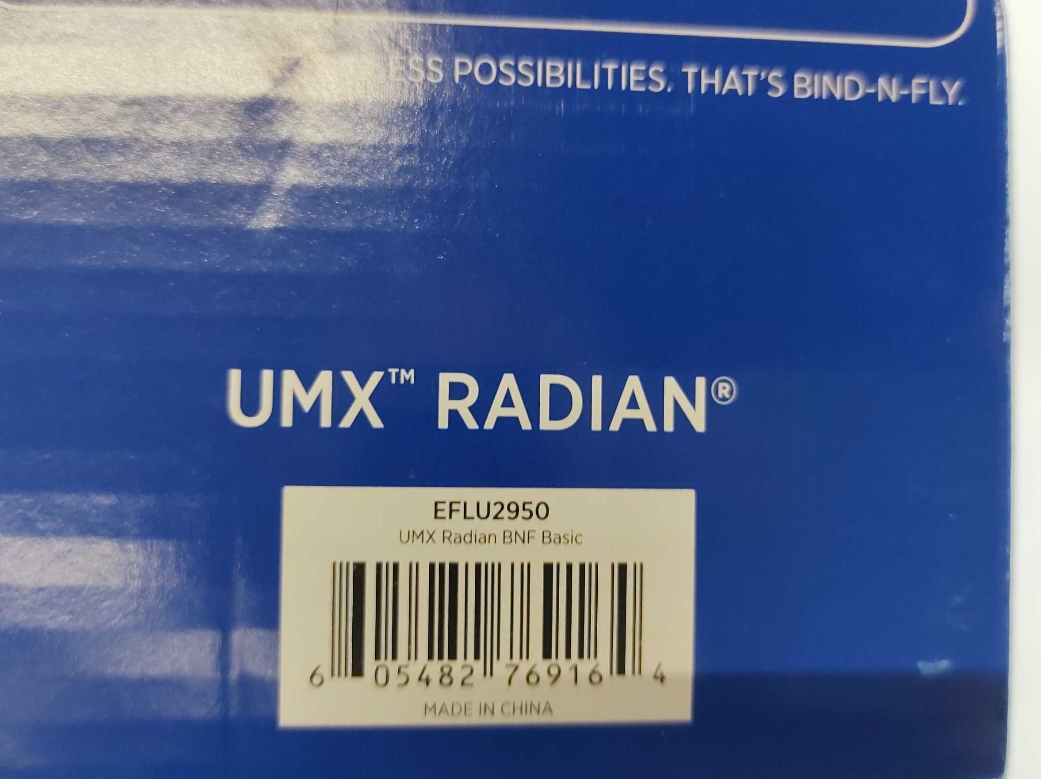 E-flite UMX Radian BNF Basic. De E-flite UMX Radian BNF Basic is een ultralichte motorzwever voor beginners en gevorderden. AS3X stabilisatie en optionele SAFE Select houden vlucht stabiel, terwijl batterijtelemetrie naar compatibele zenders rust geeft. V
