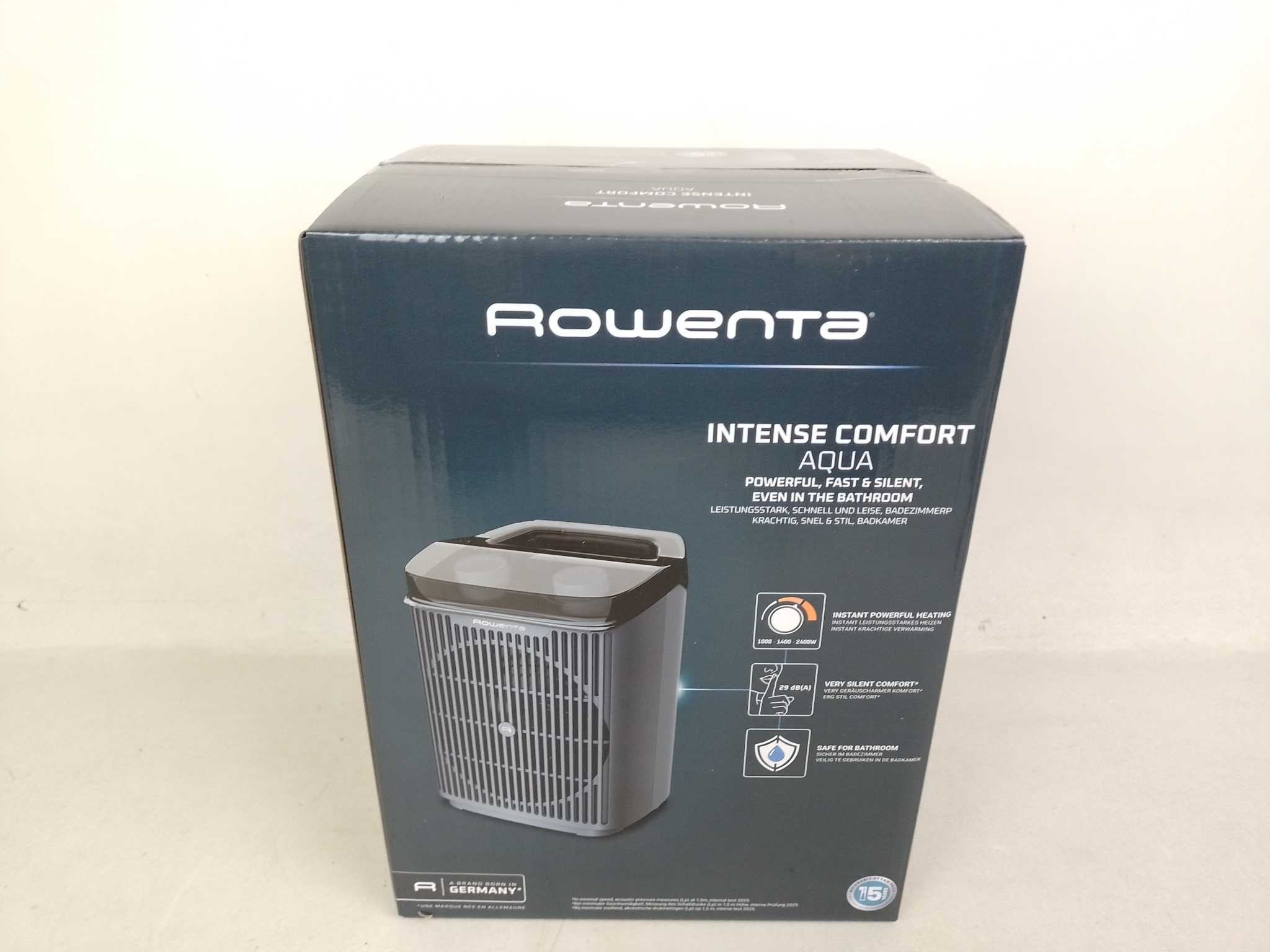 Rowenta Ventilatorkachel Intense Comfort Aqua - SO6551. Verwarm snel en veilig badkamer of werkkamer met de Rowenta Instant Comfort Aqua SO6551 ventilatorkachel. Met 2400W vermogen en keuze uit Eco, Medium en Turbo breng je ruimtes tot circa 40 m² direct op temperatuur. De stille modus van 29 dB is ideaal voor slapen of thuiswerken. IP21 spatwaterbescherming maakt hem geschikt voor vochtige ruimtes. Instelbare thermostaat, timer en zomer-ventilatiestand bieden comfort het hele jaar. Kantelbeveiliging, oververhittingsbeveiliging en automatische uitschakeling zorgen voor gemoedsrust. Compact met draaghandvat en makkelijk te verplaatsen.