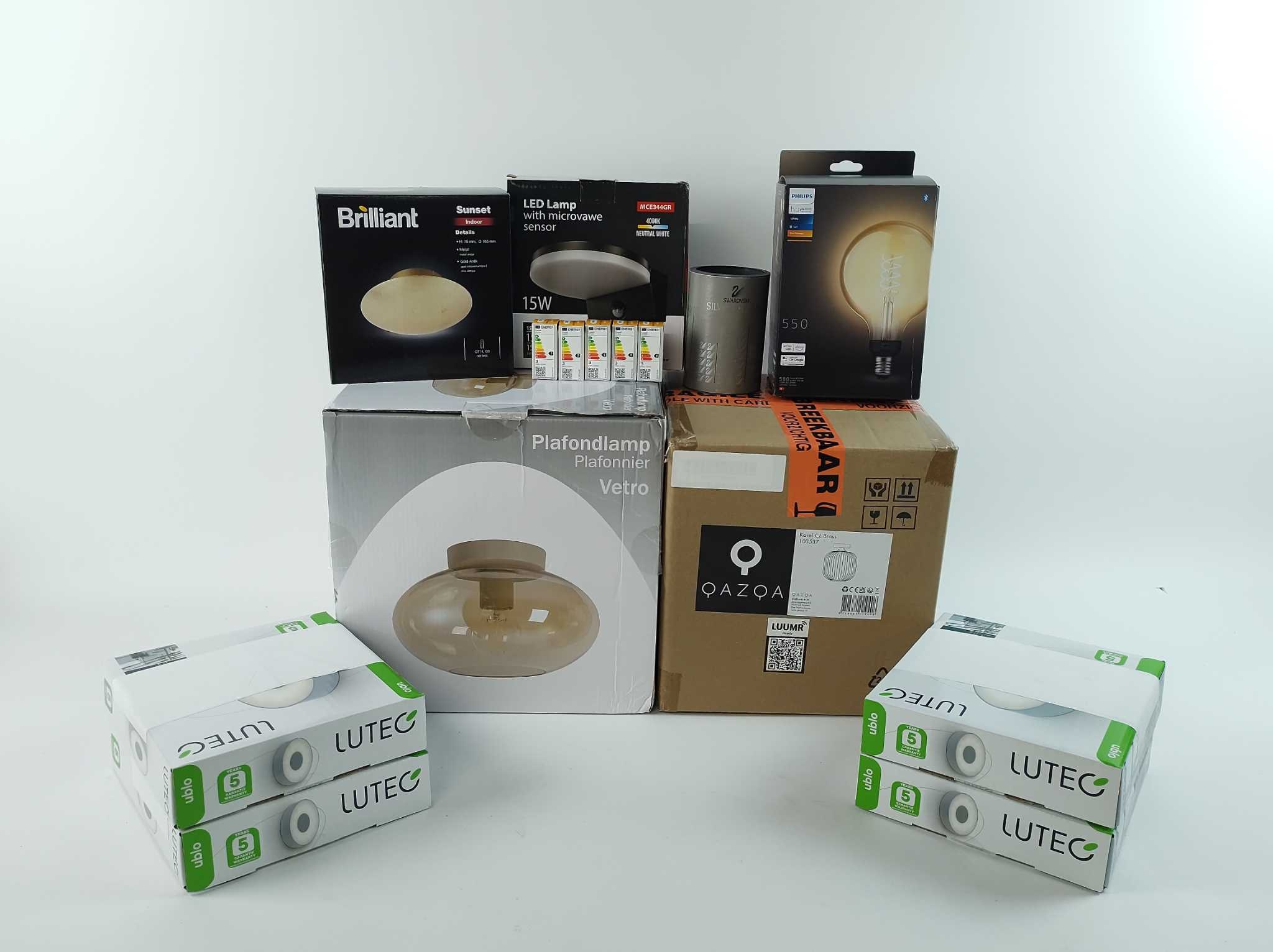 Voordeelbox Woonaccessoires #2. Verlichting + design in één voordeelbox: 15 artikelen (8 soorten) met o.a. Qazqa Art Deco plafondlamp, 4x Lutec Ublo plafond/wandlamp, Gamma Vetro amber plafonlamp, Philips Hue filament G125 E27, 5x LUEDD G9 LED-lampjes, Brilliant Sunset wandlamp, Maclean sensor-buitenlamp (IP65) én een Swarovski uil-figuur. Mix van binnen- en buitenverlichting plus Hue-lamp: ideaal om sets te maken of alles los te verkopen. Profiteer van onze bundelprijs bij Retourplaza: op=op, bestel vandaag en bespaar!