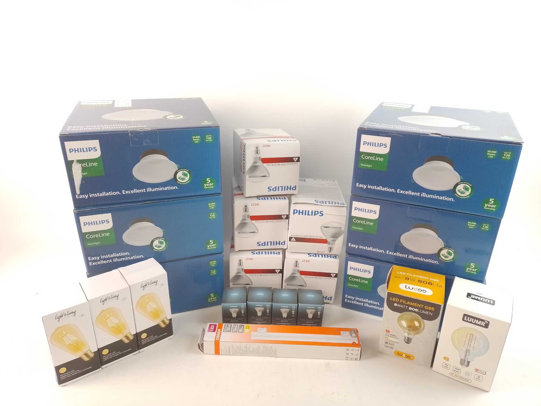 Voordeelbox Verlichting #3. Verlicht je project of voorraad in één klap met deze Verlichting voordeelbox: 21 artikelen (7 unieke) met o.a. 6x Philips LED downlight Coreline (2300 lm), 5x Philips BR125 IR E27, meerdere dimbare LED-lampen (amber en smart E27 G95), Ledvion Full Glass LED spots en een Ledvance LED tube. Perfect voor installateurs, klusbedrijven of doorverkopers: mix van A-merken en hardlopers. Profiteer van onze bundelprijs bij Retourplaza: op=op, bestel vandaag en bespaar!