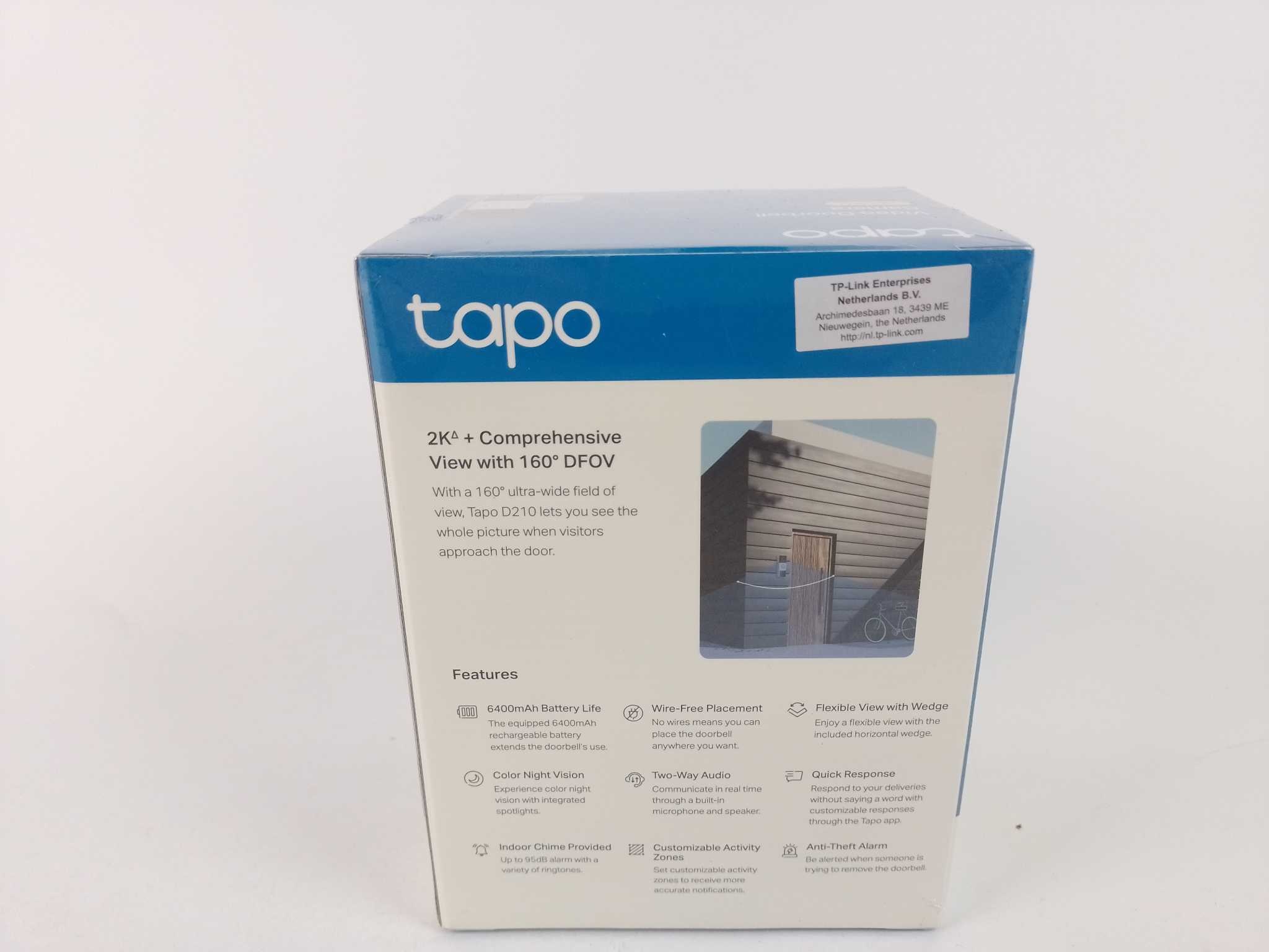 TP-Link Video Deurbel Tapo D210. De TP‑Link Tapo D210 is een draadloze 2K-video deurbel met ingebouwde 6400 mAh accu (tot 6 maanden autonomie) en breed 160° gezichtsveld. Dankzij heldere kleurennachtzicht tot 7,6 m en twee‑weg audio kun je bezoekers zowel