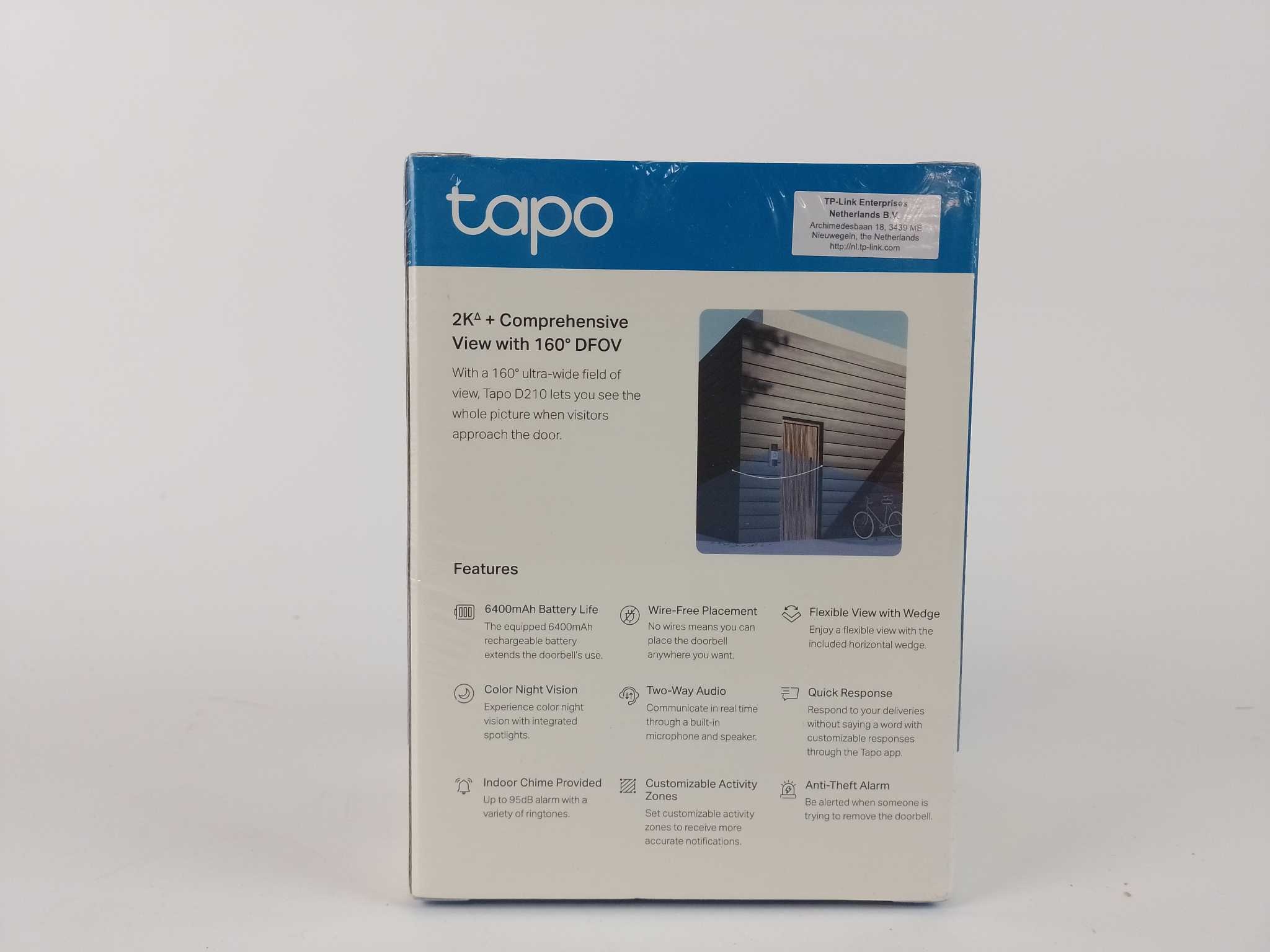 TP-Link Video Deurbel Tapo D210. De TP‑Link Tapo D210 is een draadloze 2K-video deurbel met ingebouwde 6400 mAh accu (tot 6 maanden autonomie) en breed 160° gezichtsveld. Dankzij heldere kleurennachtzicht tot 7,6 m en twee‑weg audio kun je bezoekers zowel