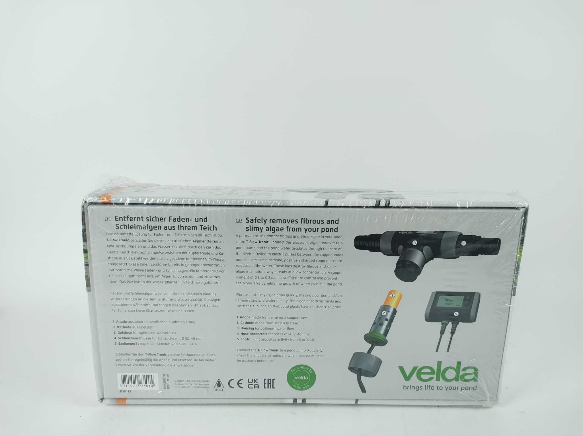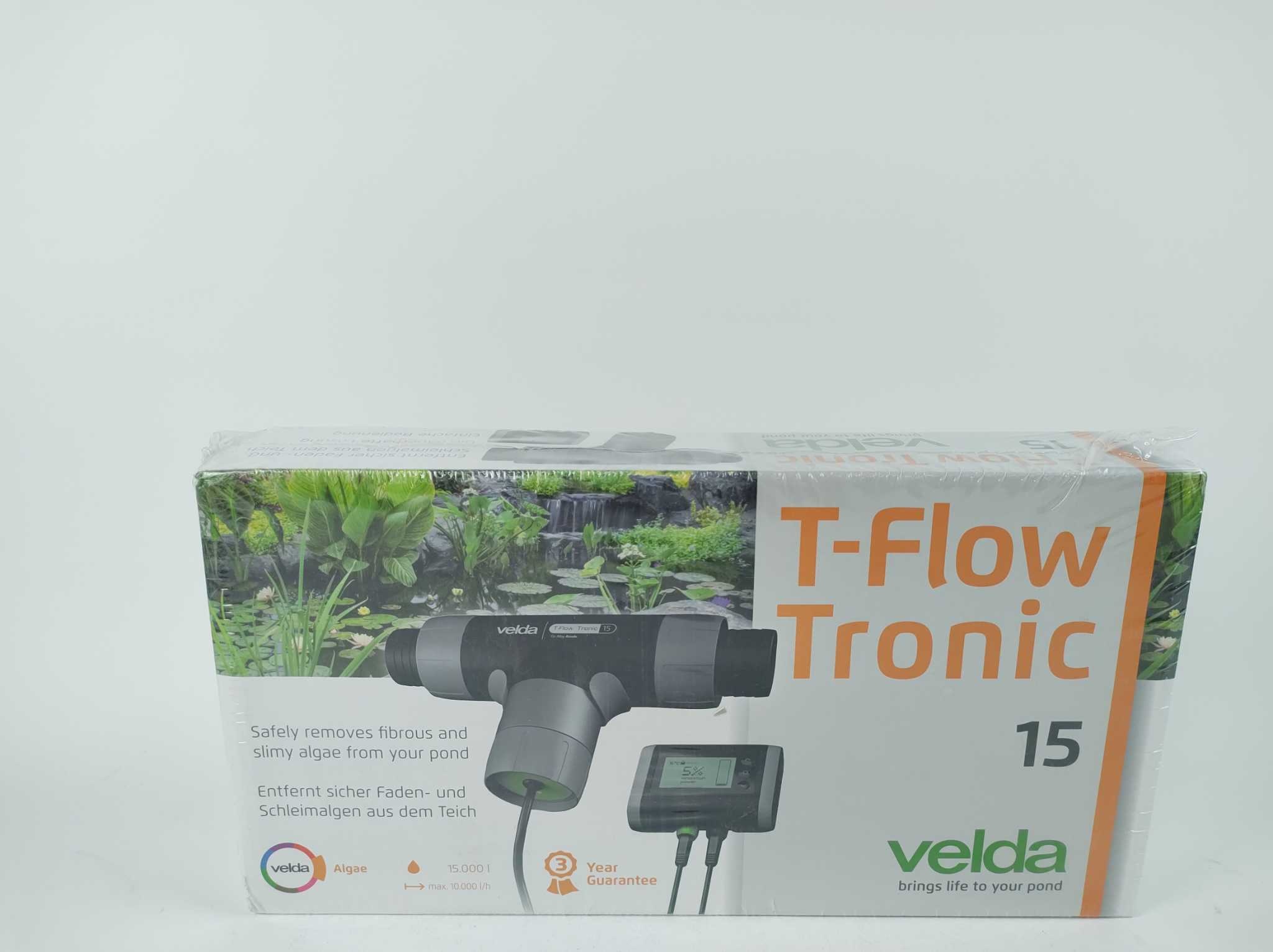 Velda Vijverfilter T-Flow Tronic 1500. De Velda T-Flow Tronic 15 houdt vijvers tot 15.000 liter vrij van draad- en slijmalgen via veilige koperionisatie. De T-configuratie verbetert het debiet, terwijl microprocessorsturing en ingebouwde thermometer optim