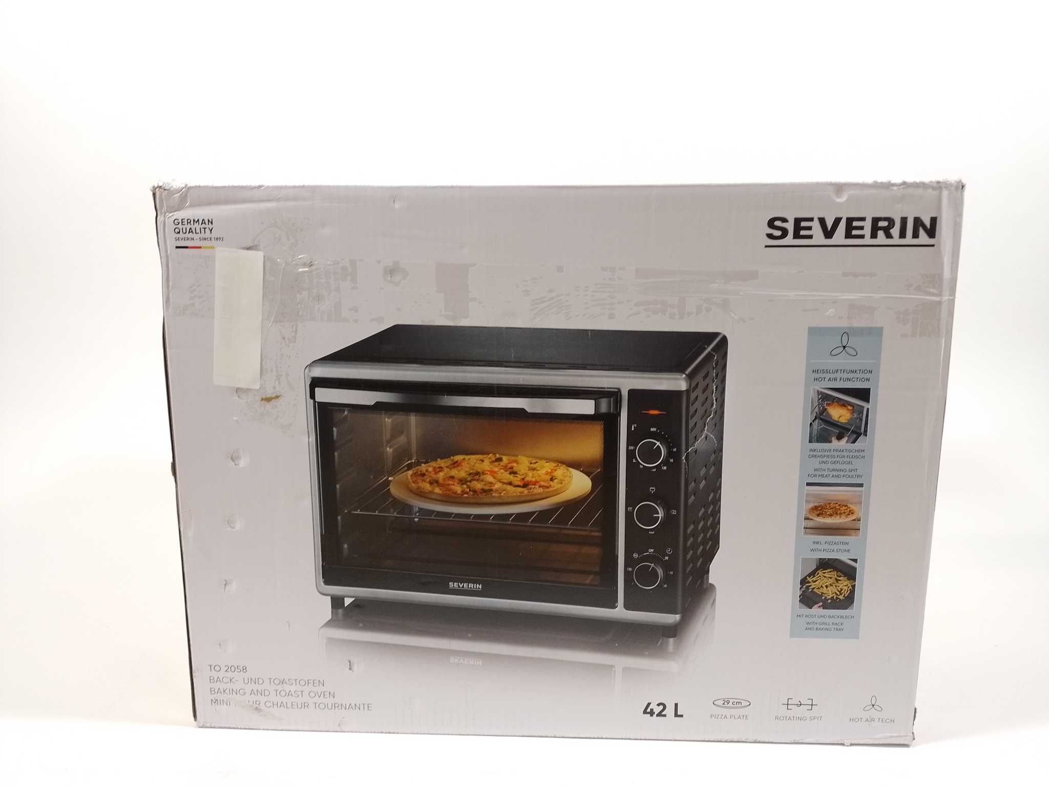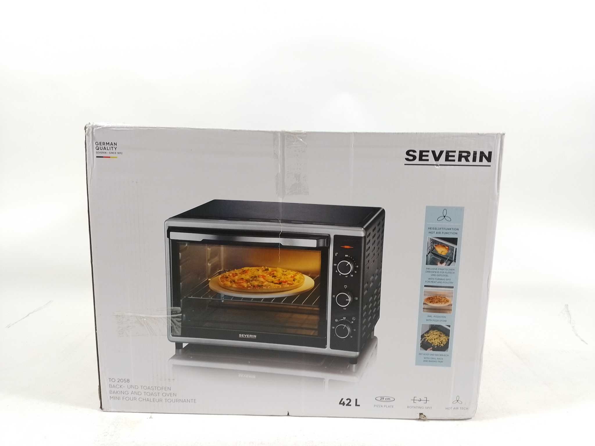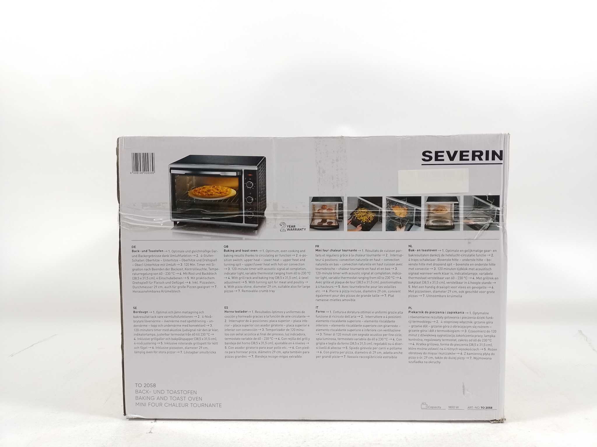 Severin Vrijstaande Oven TO 2058 - Zwart. Bereid pizza, kip en taarten moeiteloos met de Severin TO 2058 heteluchtoven (42 liter). Met 1800 W vermogen, 60–230°C temperatuurregeling, 120-minutentimer en 4 verwarmingsstanden (boven-, onder-, grill, heteluch