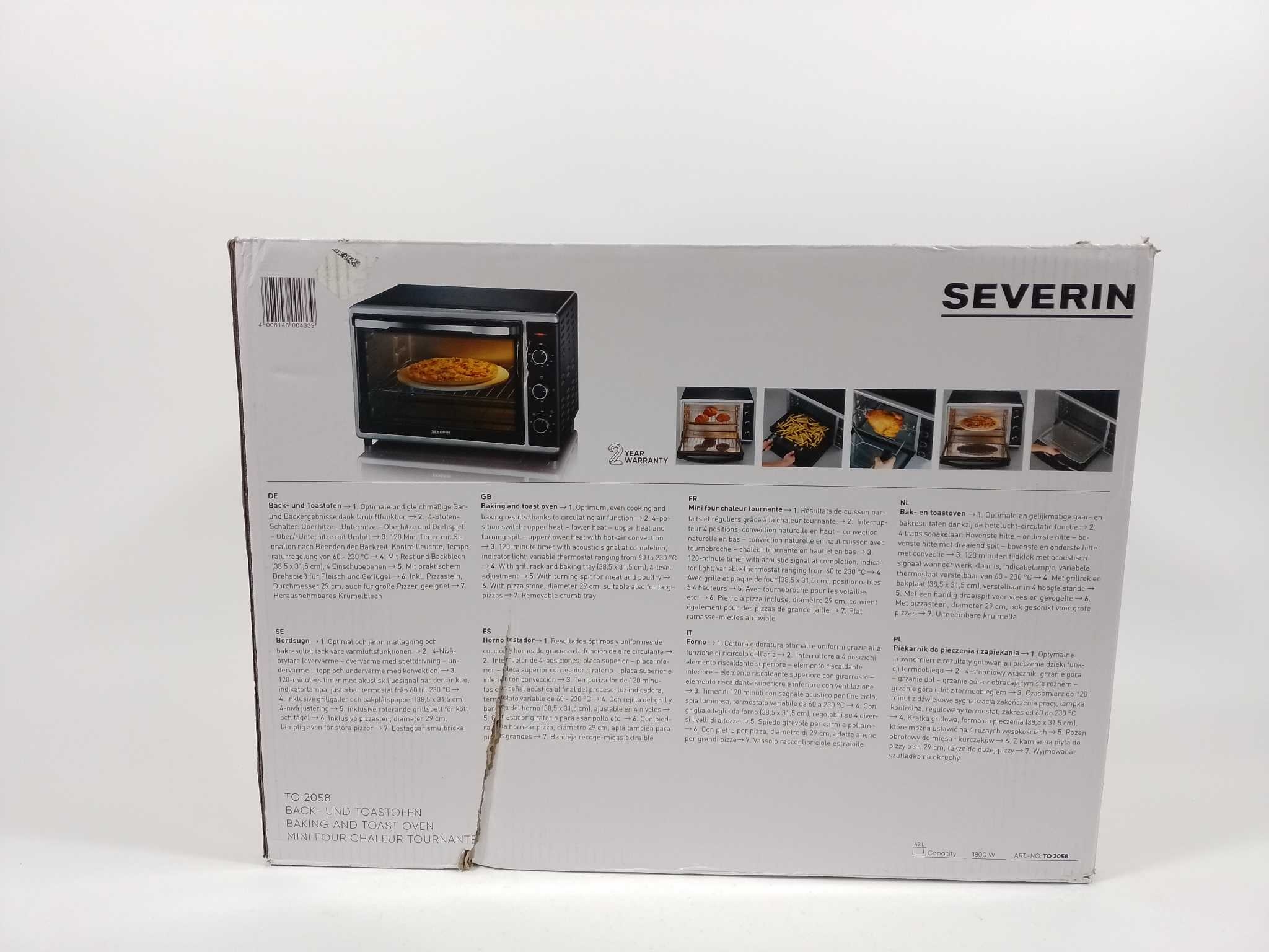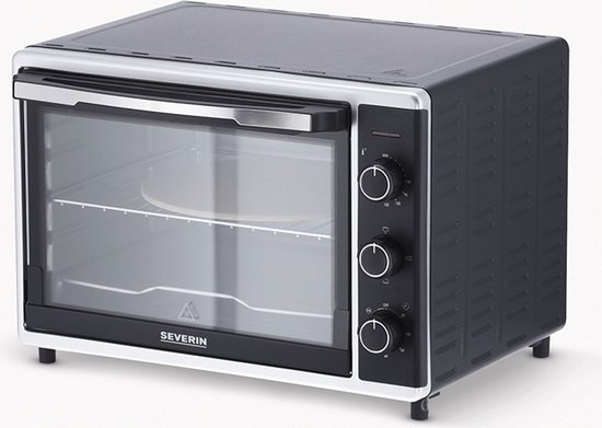 Severin Vrijstaande Oven TO 2058 - Zwart. Bereid pizza, kip en taarten moeiteloos met de Severin TO 2058 heteluchtoven (42 liter). Met 1800 W vermogen, 60–230°C temperatuurregeling, 120-minutentimer en 4 verwarmingsstanden (boven-, onder-, grill, hetelucht) kook je sneller en gelijkmatiger. Compact ontwerp met grote inhoud past in elke keuken. Meegeleverd: pizzasteen (Ø 29 cm), draaispit, grillrooster, bakplaat en handleiding. Ideaal voor krokante pizza, sappige braadgerechten en dagelijks bakken. Eenvoudige draaiknoppen en binnenverlichting zorgen voor gebruiksgemak en controle tijdens het bereiden. Snel opgewarmd en gemakkelijk schoon te maken.
