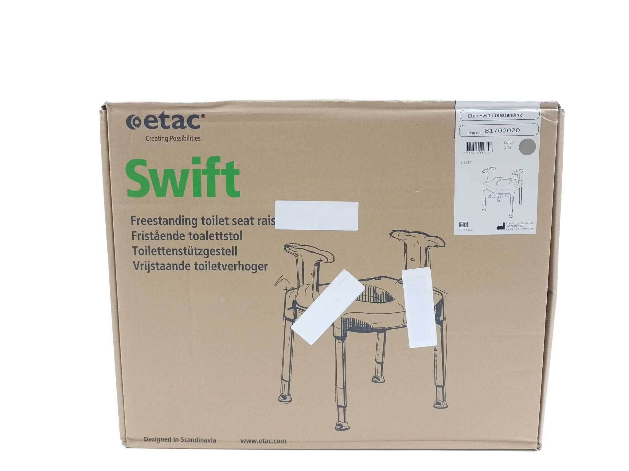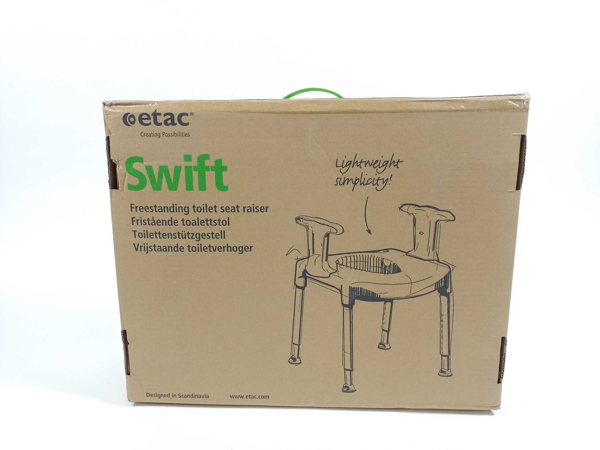 Etac Vrijstaande Toiletverhoger Swift. Verhoog comfort en veiligheid met de Etac Swift vrijstaande toiletverhoger met armleuningen. In hoogte verstelbaar en lichtgewicht, met brede footprint en antislip doppen voor uitstekende stabiliteit. Zitting met geï