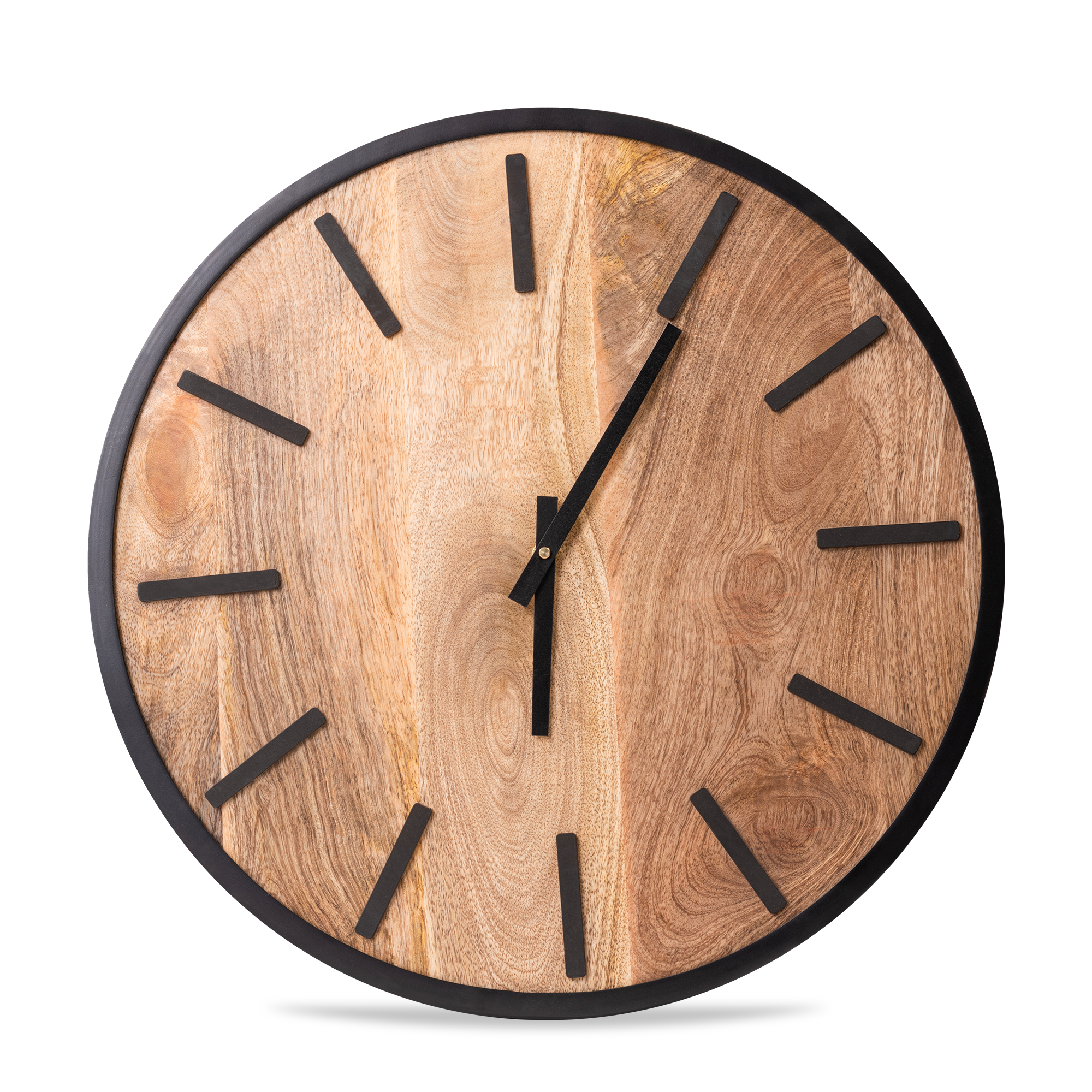 Benoa Wandklok Mango - 50cm. Geef je muur karakter met de Benoa Wandklok Mango Medium van 50 cm. Het solide mangohouten blad brengt warme, natuurlijke tinten in huis, terwijl de strakke zwarte ring zorgt voor een stoer industrieel accent. Met zijn royale