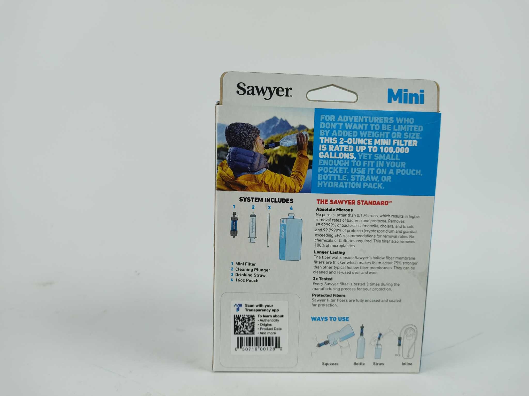 Sawyer Waterfilter SP128 - Mini - Blauw. Neem veilig drinkwater mee op avontuur met de Sawyer Mini SP128 waterfilter (blauw). Het 0,1-micron hollevezel­membraan verwijdert bacteriën, protozoa en microplastics en gaat tot 100.000 gallons (~380.000 liter) mee. Schroef hem op de meegeleverde 0,5-liter knijpzak of op standaard flessen, of drink direct via het rietje. Inclusief reinigingsspuit voor eenvoudig backwashen en optimale doorstroming. Ultralicht en compact: ideaal voor wandelen, backpacken, noodpakket en reizen. Betrouwbare filtratie, snel, duurzaam en zeer gebruiksvriendelijk. Past in elke tas en is onderhoudsarm en robuust.