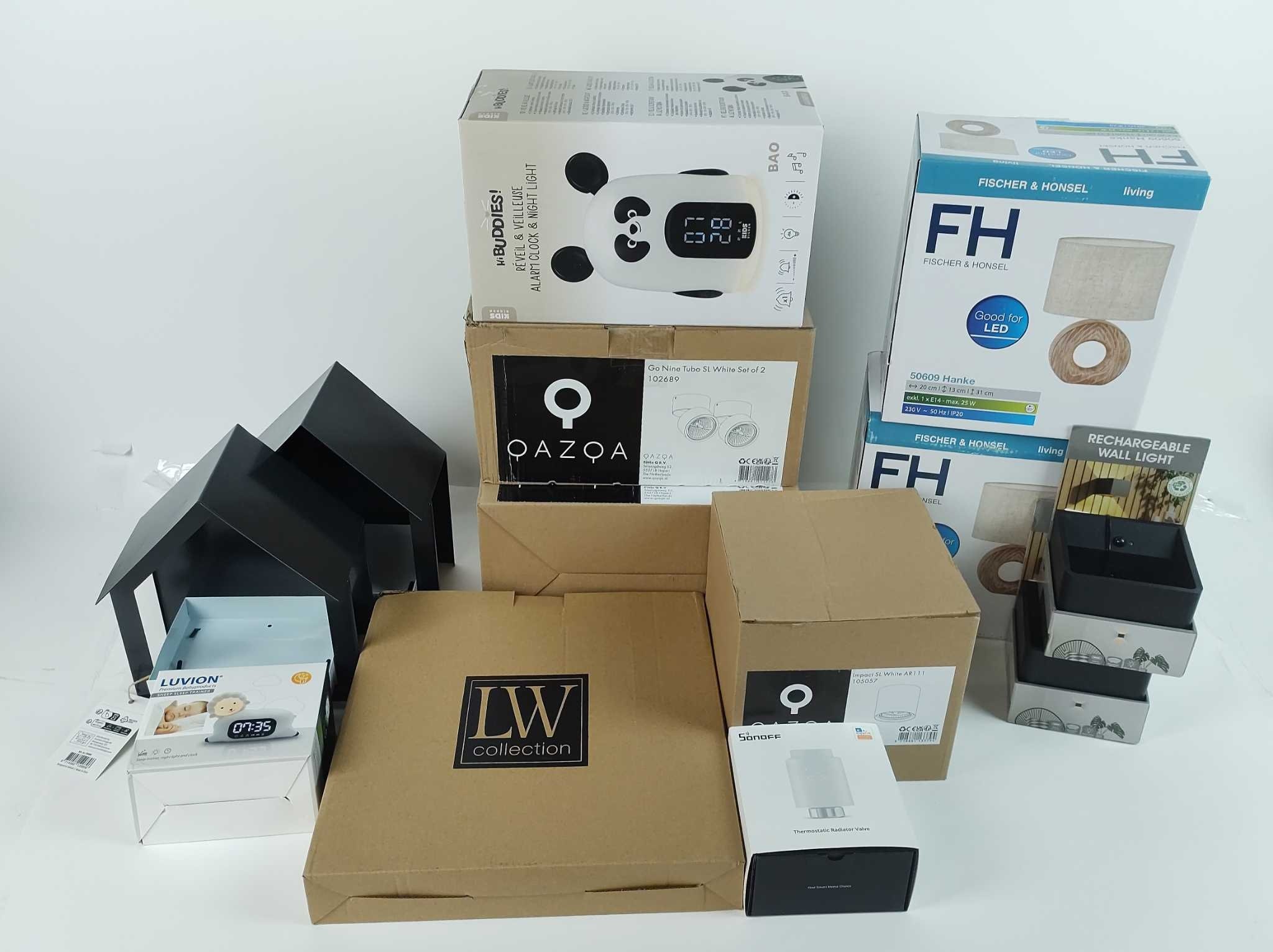 Voordeelbox Woonaccessoires #4. Deze voordeelbox Woonaccessoires bevat: 13 artikelen (9 uniek) met o.a. 2x QAZQA industriële plafondspot (2-lichts), 2x moderne tafellamp (hout/beige kap), verstelbare QAZQA plafondsport (GU10), 2x oplaadbare wandlamp met bewegingssensor (USB-C), en een Sonoff slimme thermostaatkraan voor radiatoren. Verder: kinderwekker/nachtlamp Bao de Panda, Luvion schaap slaaptrainer, LW Collection keuken/wandklok en 2x Esschert design muurvoedertafel. Totale winkelwaarde ca. €424,24. Ideaal voor doorverkoop of om je assortiment in één keer te vullen. Op=op—bestel nu bij retourplaza!
