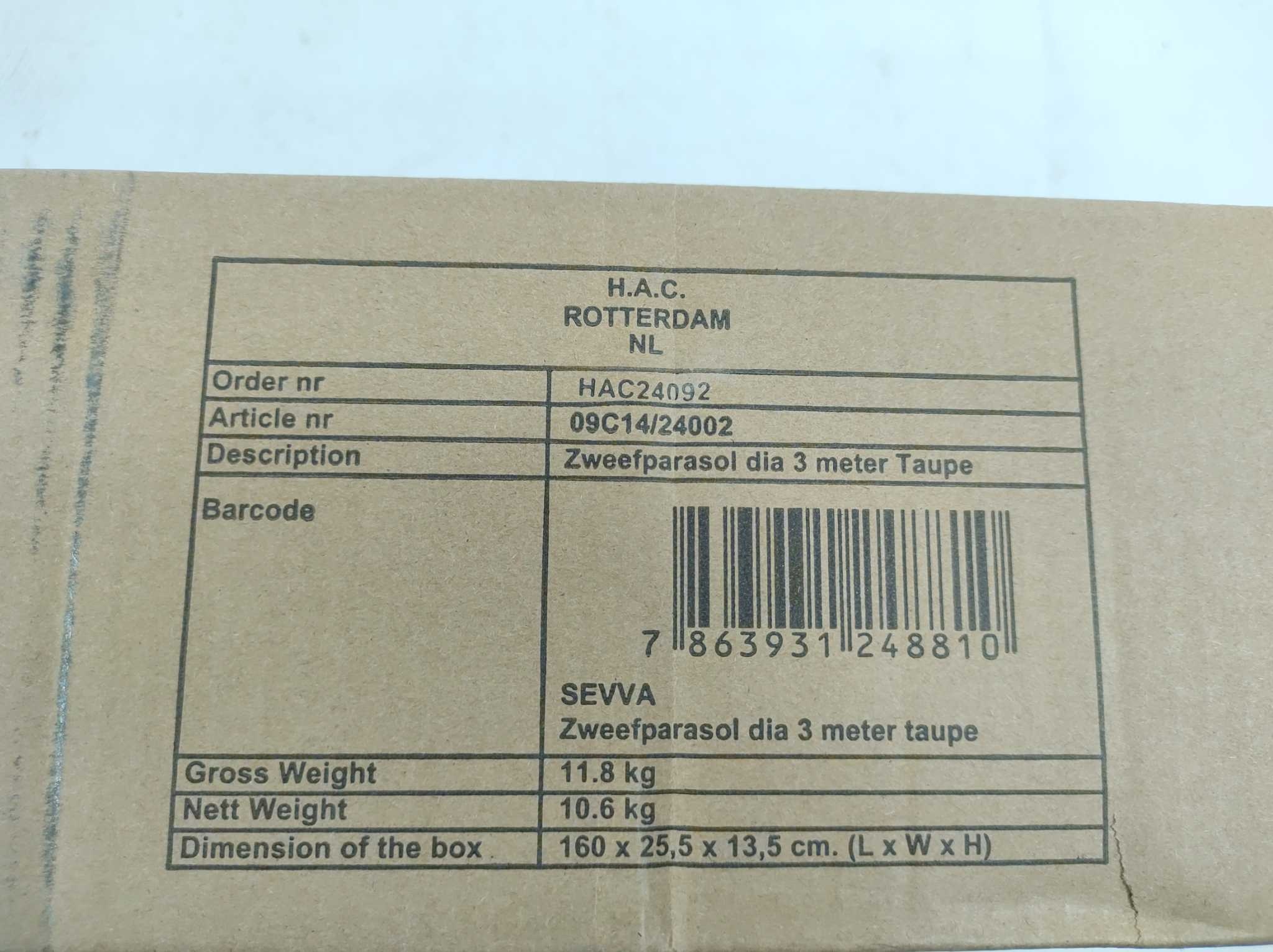 Sevva Zweefparasol XXL 3m - Taupe. De Sevva Luxe XXL Zweefparasol van 3 meter is perfect voor een beschutte tuin of terras. De taupe kleur zorgt voor een elegante uitstraling, terwijl het kantelsysteem zorgt voor optimale schaduw, zelfs bij veranderende z